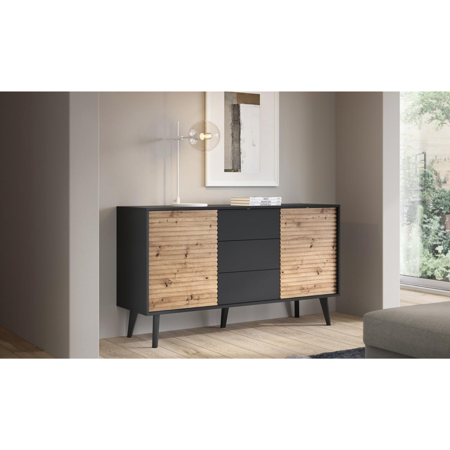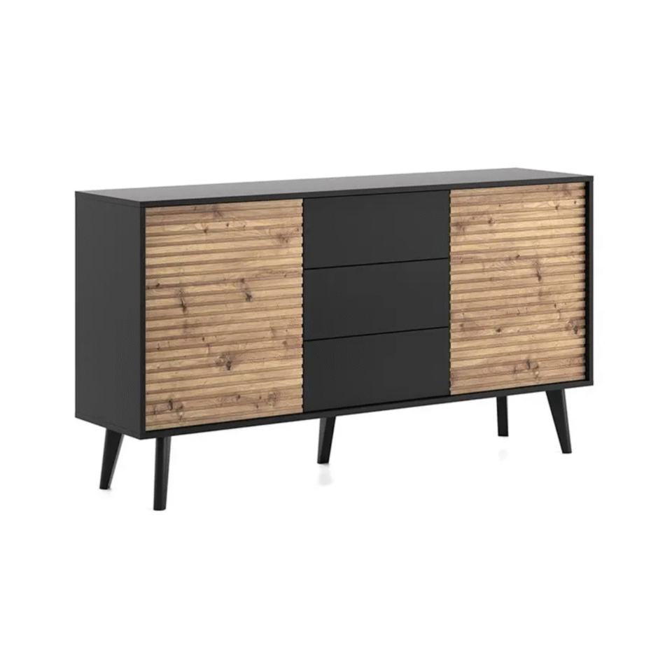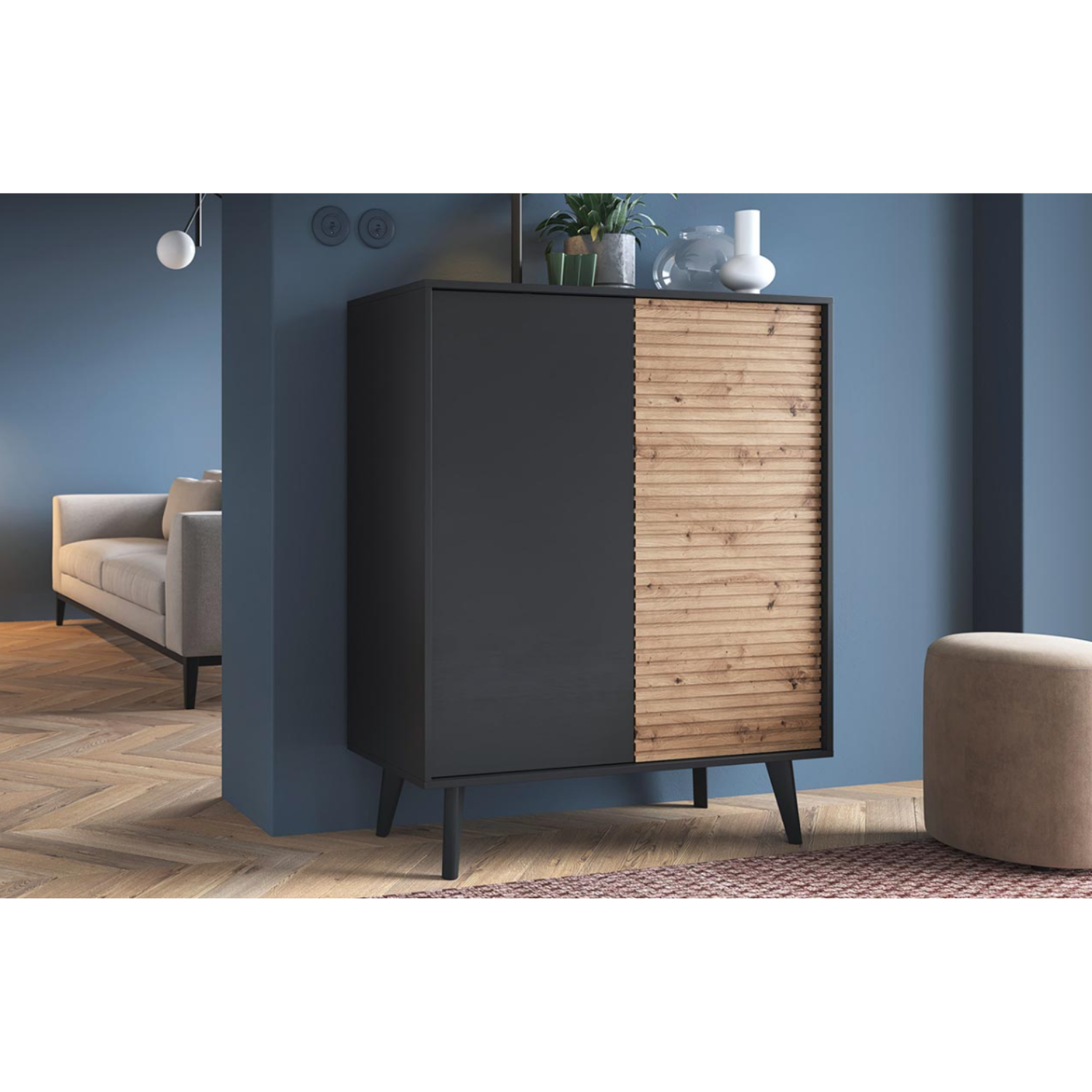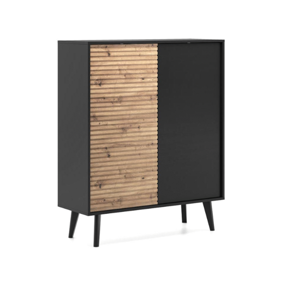 Dizajn s vodoravnim linijama na frontama i crnim detaljima unosi savremenost, dok visoke crne drvene nogice daju prozračnost i lakoću prostoru. Otvaranje bez ručki dodatno naglašava minimalistički i elegantan izgled.
