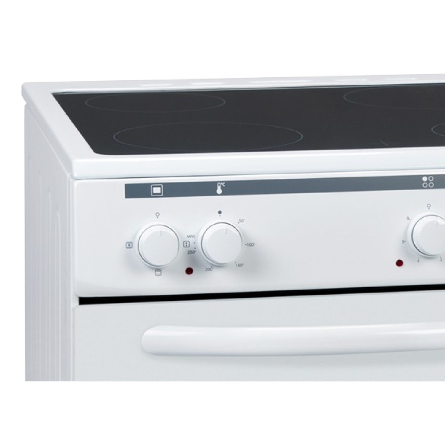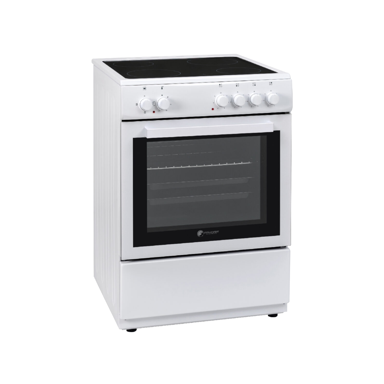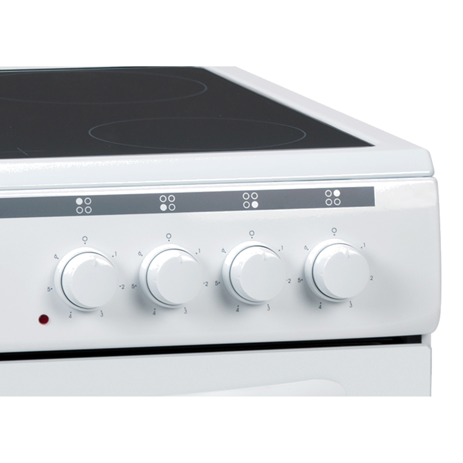 Keramički šporet širine 60 cm u bijeloj boji sa 4 zone kuhanja i pećnicom kapaciteta 65 litara. Opremljen je energetskim razredom A, 2 duboke tepsije, rešetkom i osvjetljenjem u pećnici.