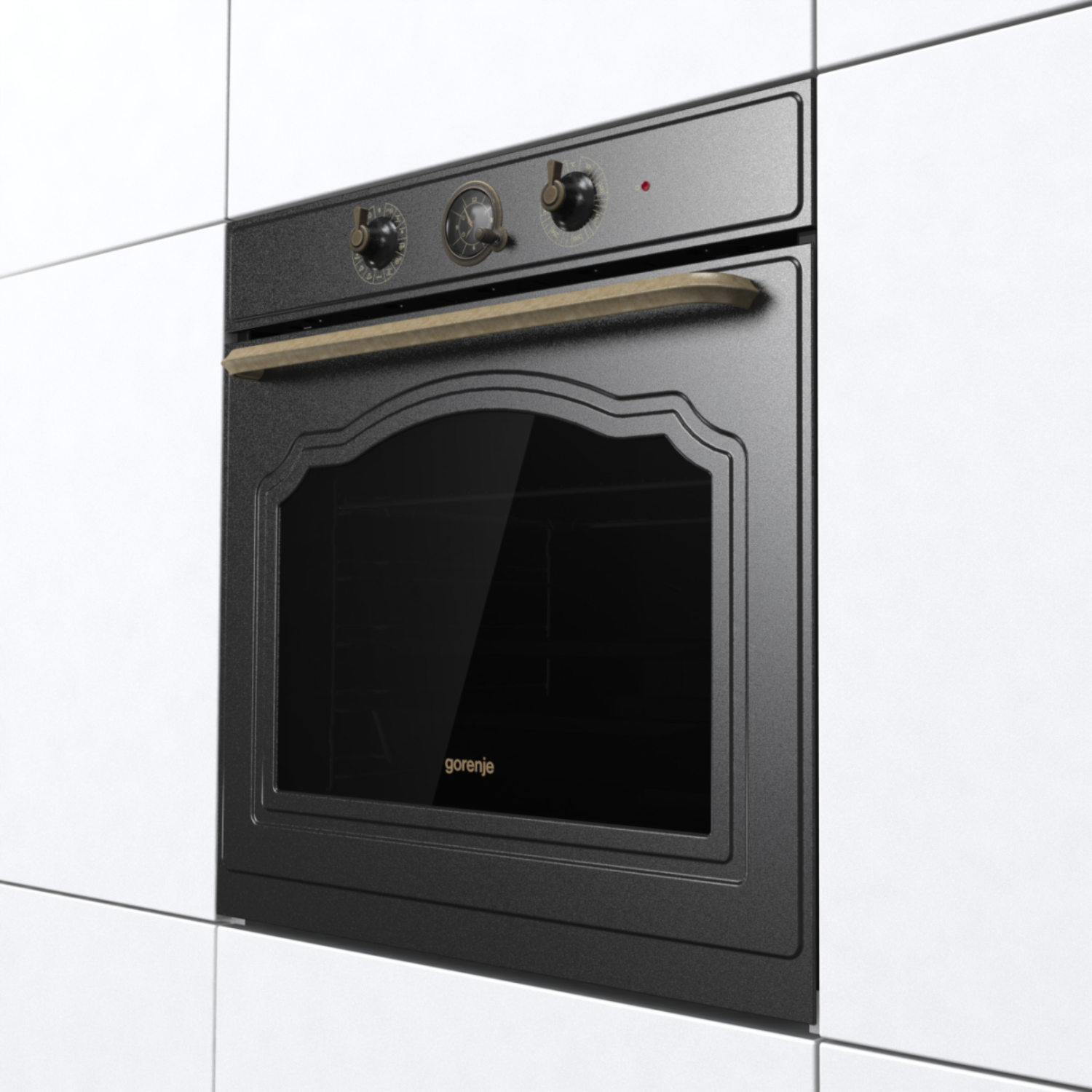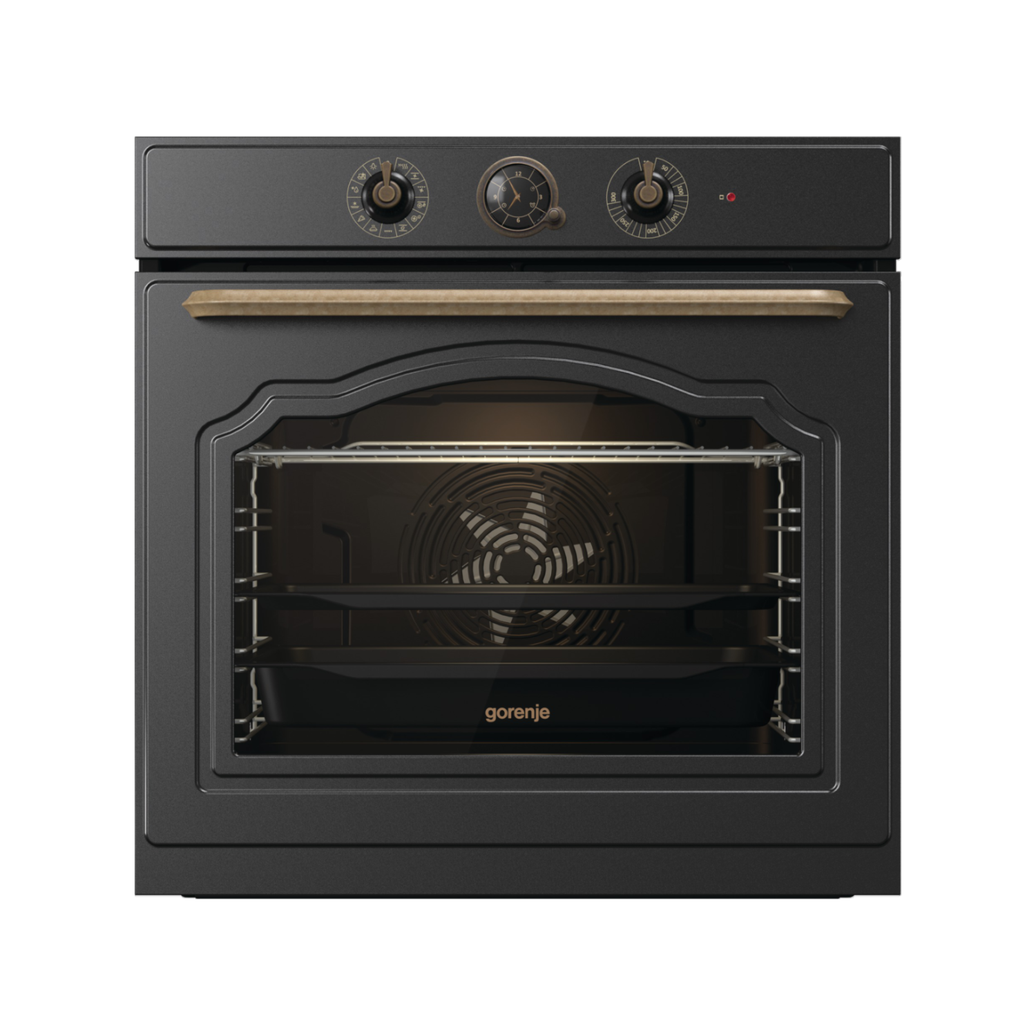 Dekorativni retro sat sa zlatnim detaljima omogućava programiranje početka i završetka pečenja, te daje pećnici autentičan klasični izgled.