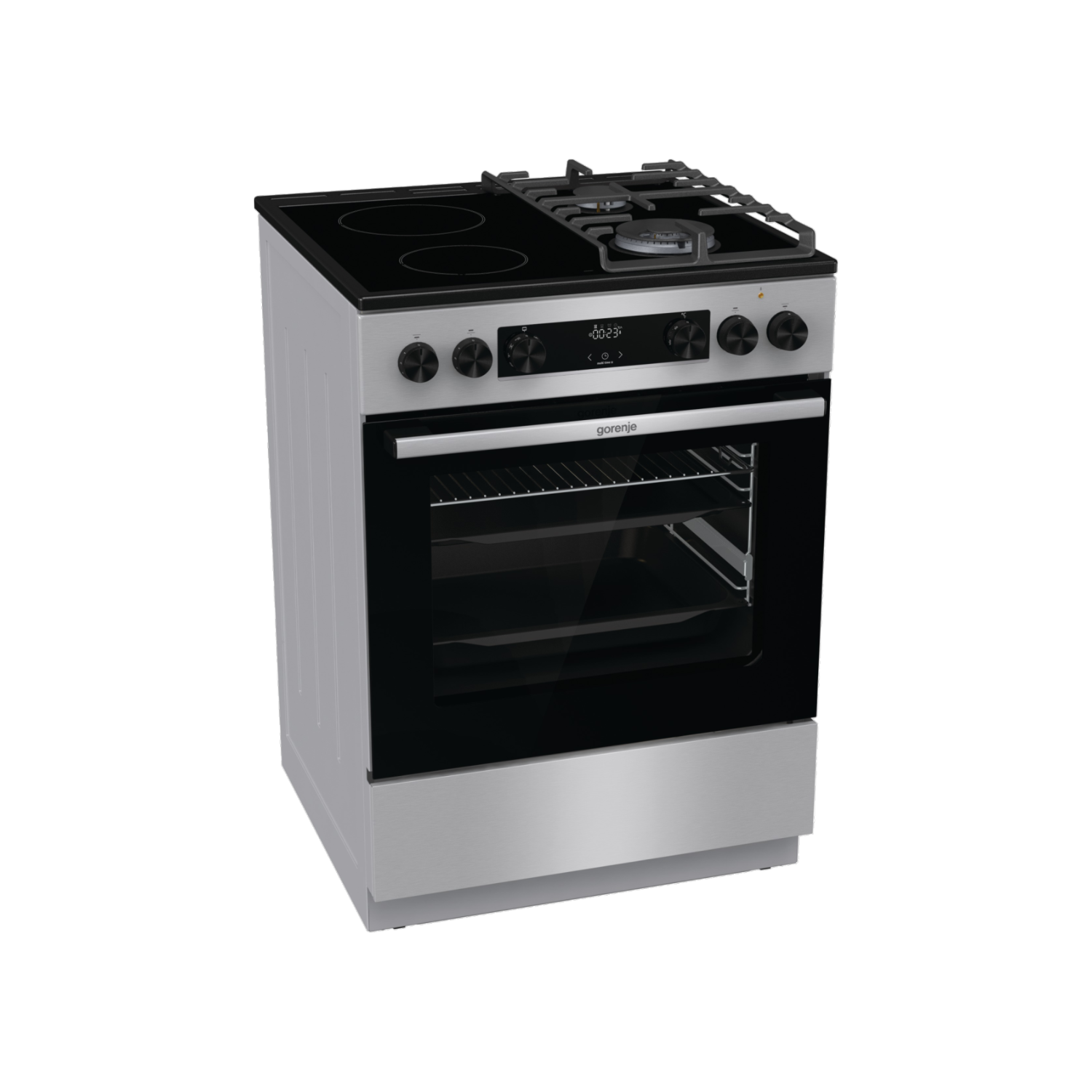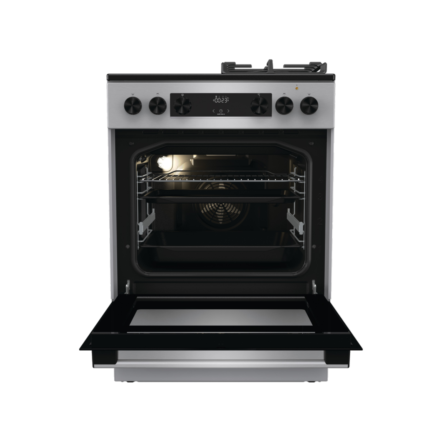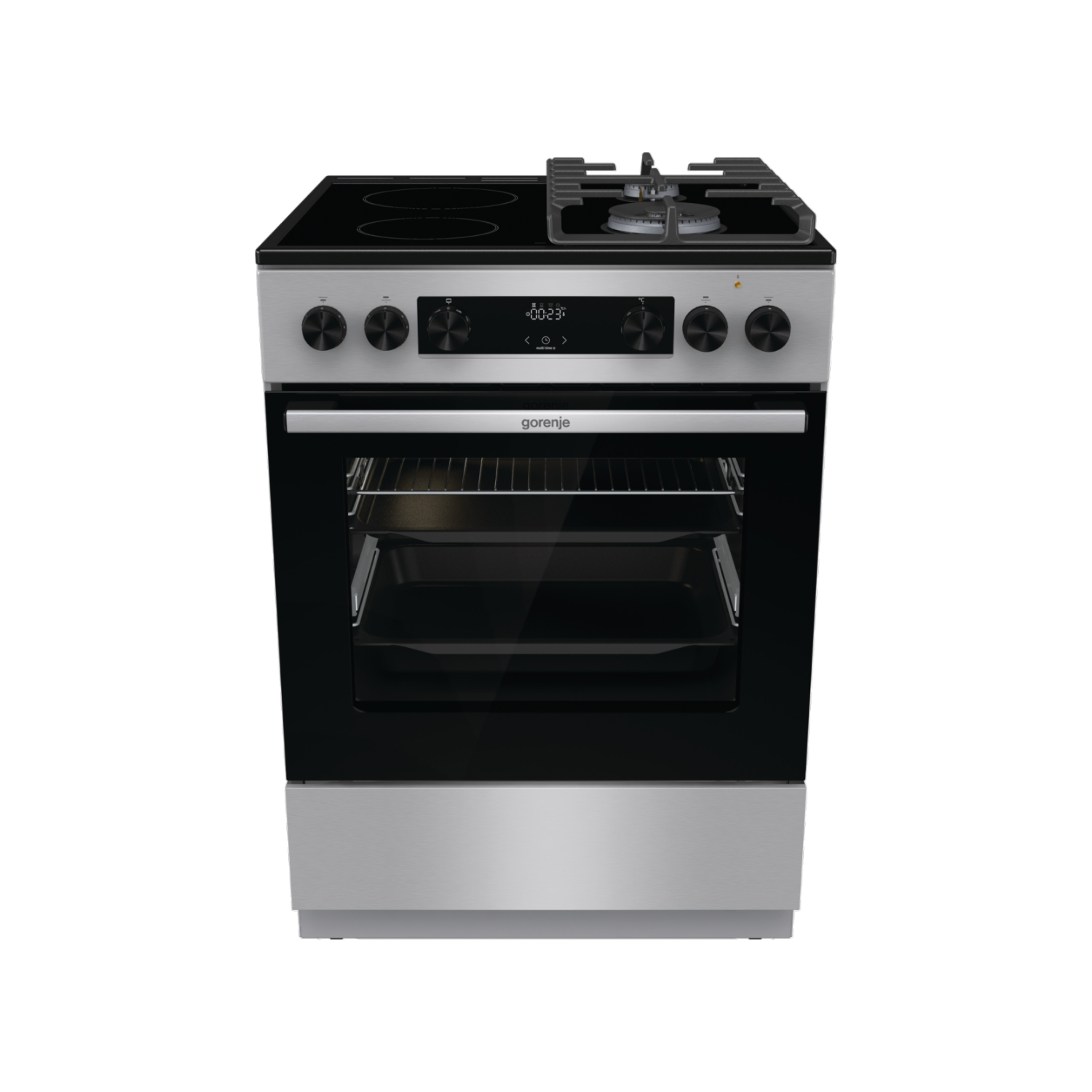 Gorenje GKC6C60XT donosi spoj praktičnosti plinskih i električnih grijača uz moderan inox dizajn. Na ploči se nalaze dvije električne i dvije plinske zone za kuhanje, dok SilverMatte unutrašnjost pećnice i GentleClose vrata osiguravaju dugotrajnost i udobno korištenje. Zahvaljujući MultiAir tehnologiji, pečenje je ravnomjerno na svim nivoima, a uz specijalni Pizza program (do 275°C) i FrozenBake opciju, priprema jela je brža i jednostavnija.