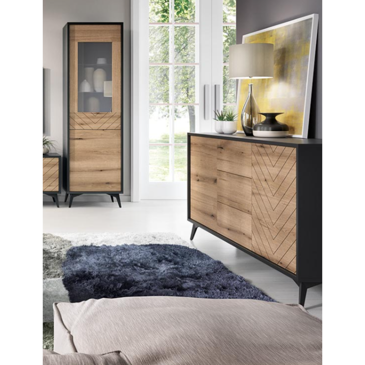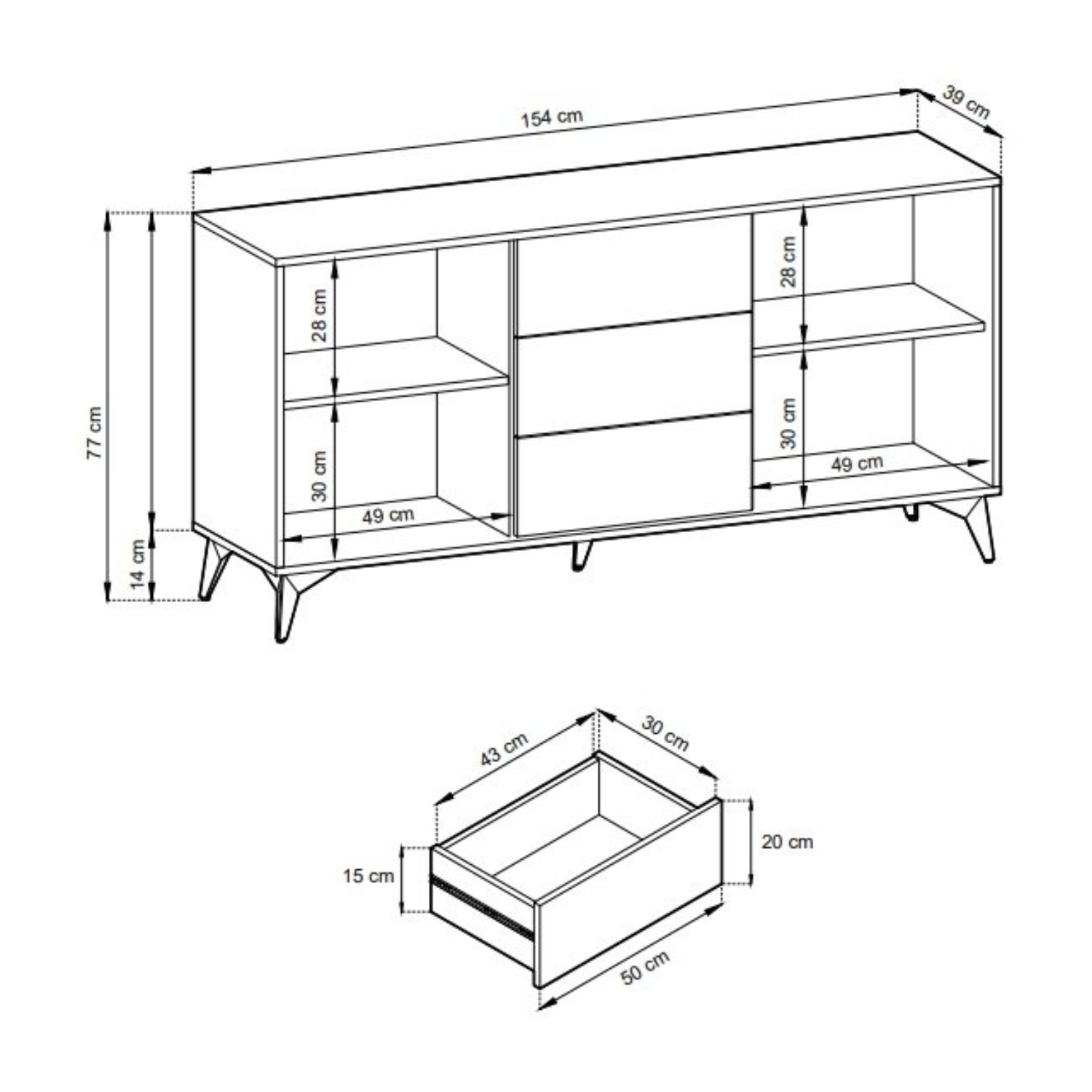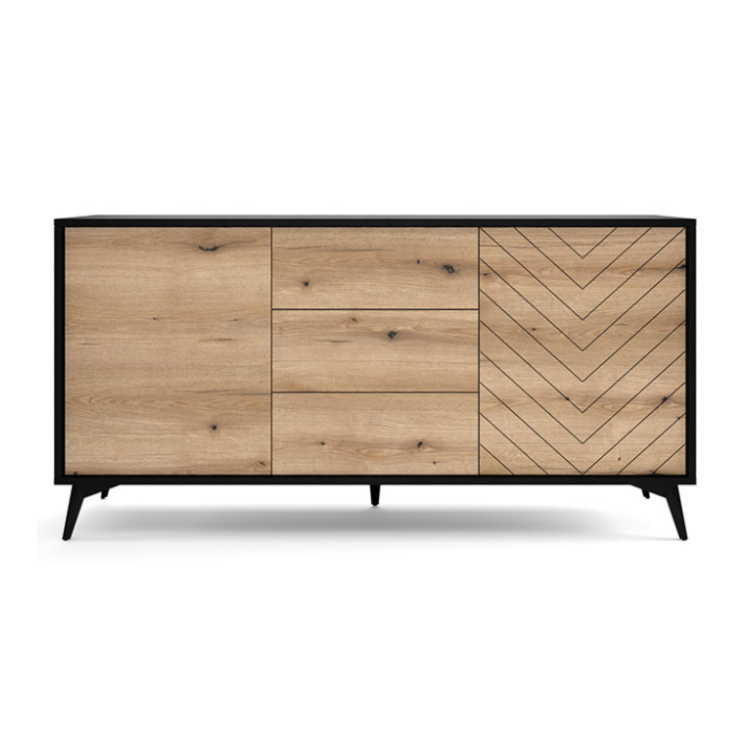 Osim estetike, komoda nudi i funkcionalnost – prostrani unutrašnji odjeljci savršeni su za organizaciju posuđa, dokumenata, odjeće ili drugih potrepština. Crne metalne nogice visine 14 cm daju prozračnost cijeloj konstrukciji i olakšavaju čišćenje ispod komode.