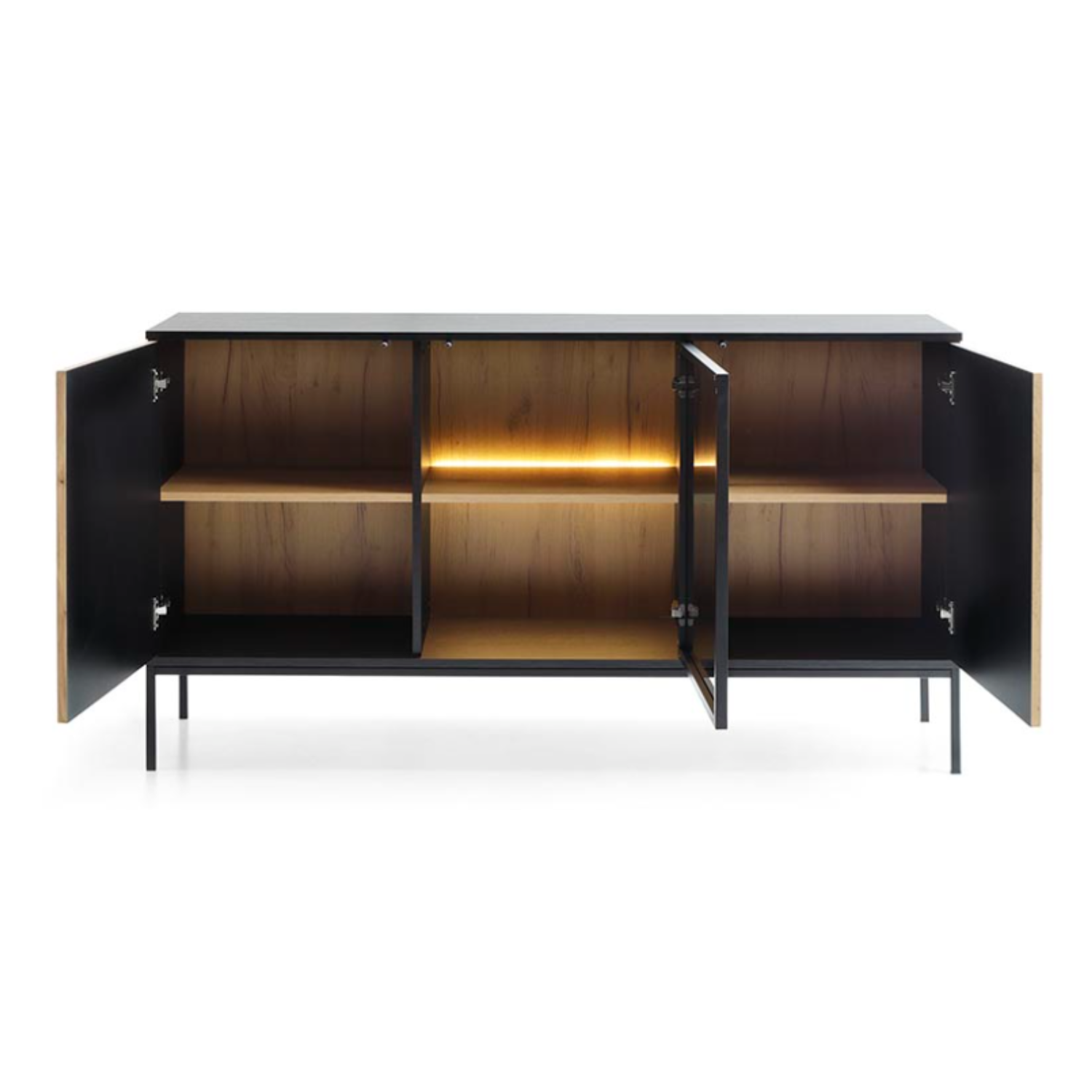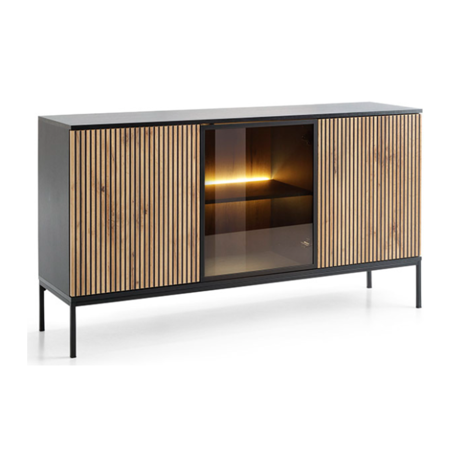 Sento K154 je moderna komoda sa staklom u kombinaciji crne boje i dekora Wotan hrasta, idealna za elegantne dnevne boravke. LED rasvjeta, kaljeno staklo i sistem bez ručkica pružaju spoj estetike i funkcionalnosti.