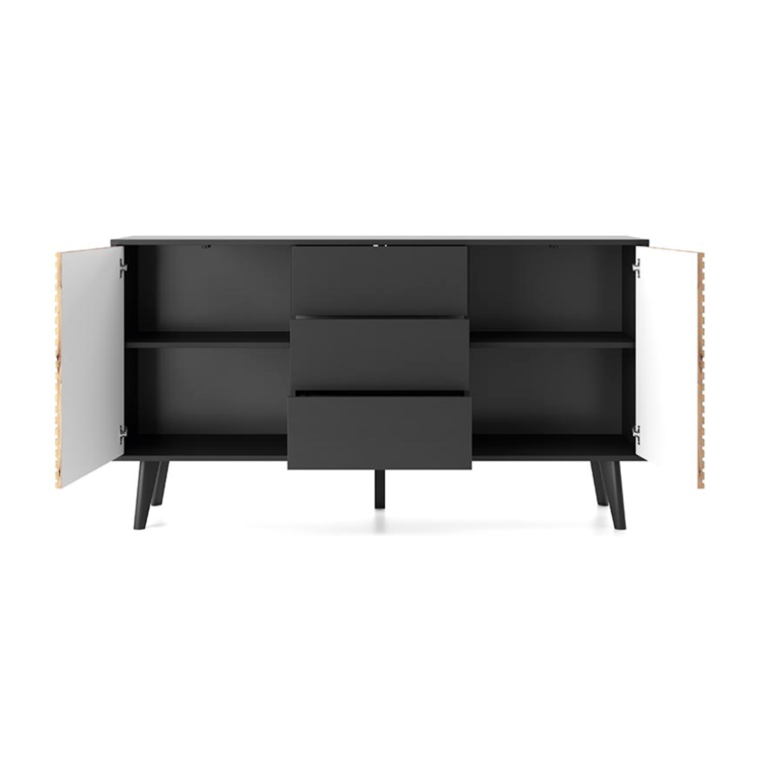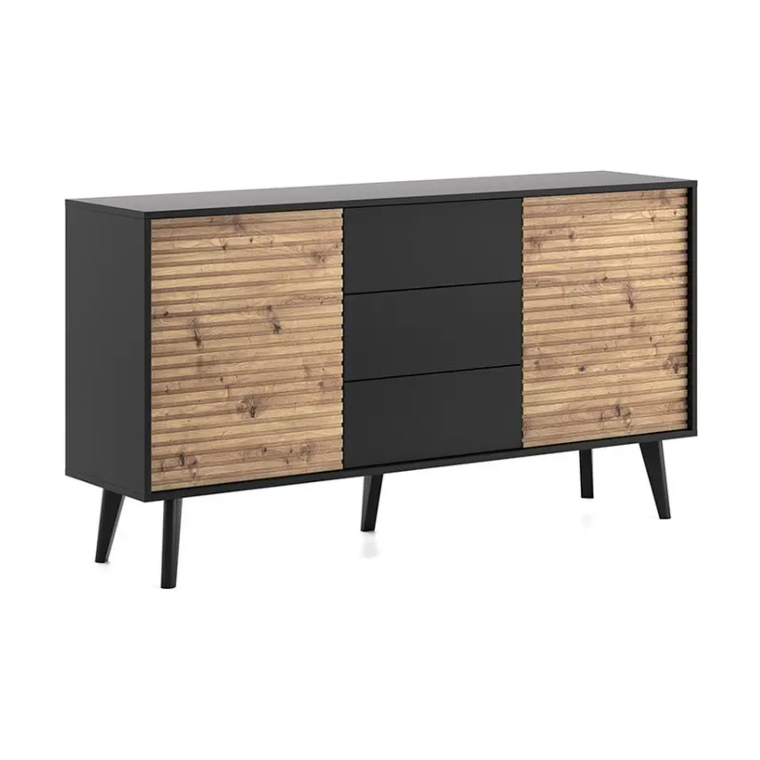 Kombinacija artisan hrasta i crnih elemenata daje moderan, industrijski karakter, dok vodoravne linije na frontama naglašavaju eleganciju. Prostrane ladice i zatvoreni ormarići omogućavaju jednostavno odlaganje stvari, dok gornja površina može poslužiti za dekoracije, knjige ili tehničku opremu.