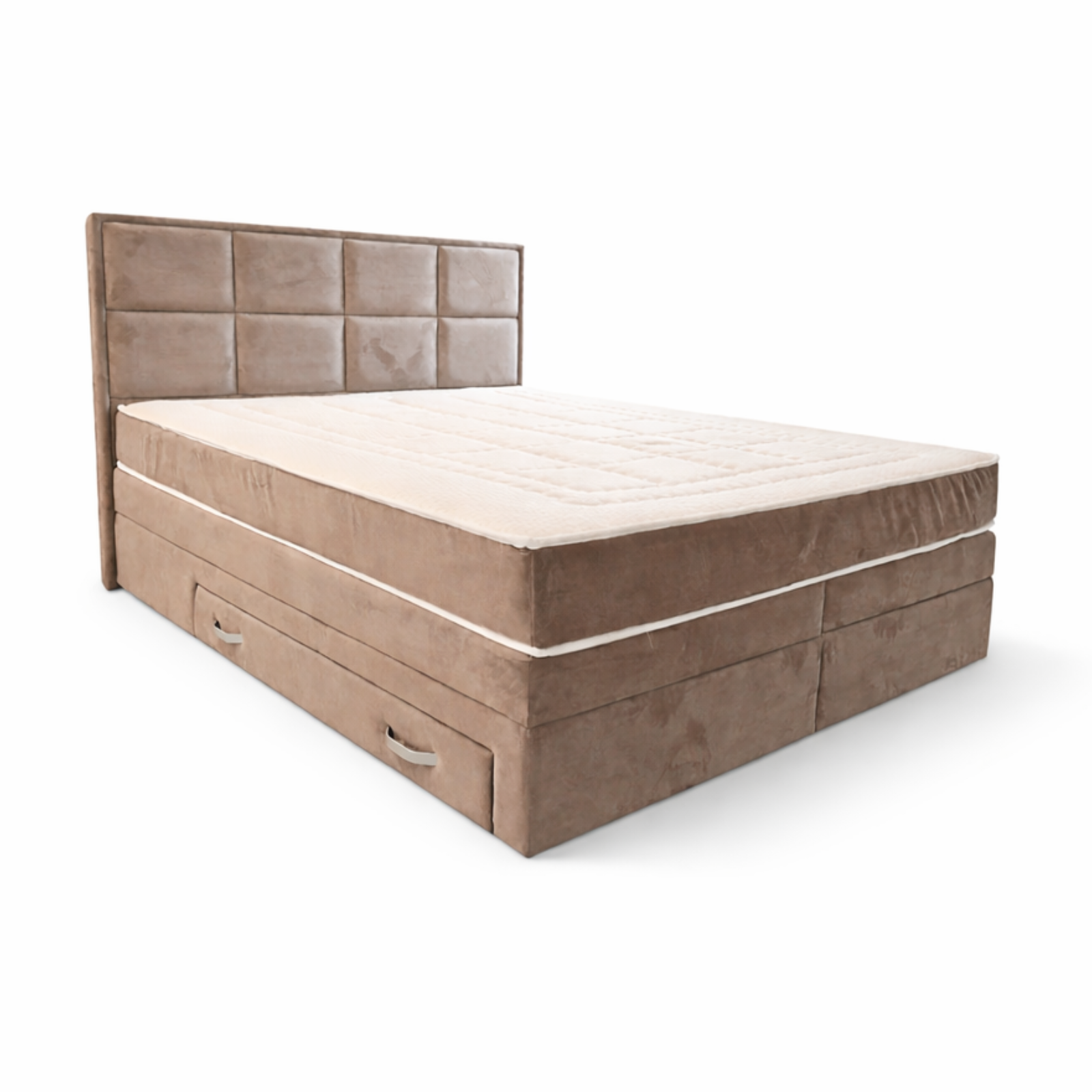 Čvrsta konstrukcija sanduka izrađena je od kvalitetne iverice, dok je uzglavlje presvučeno kvalitetnim štofom sa dekorativnim kvadratnim prošivima, pružajući elegantan izgled. U kompletu dolazi madrac sa PU pjenom normalne tvrdoće i Bonnell/džepićastim jezgrom koji osigurava optimalnu udobnost i potporu tijelu.