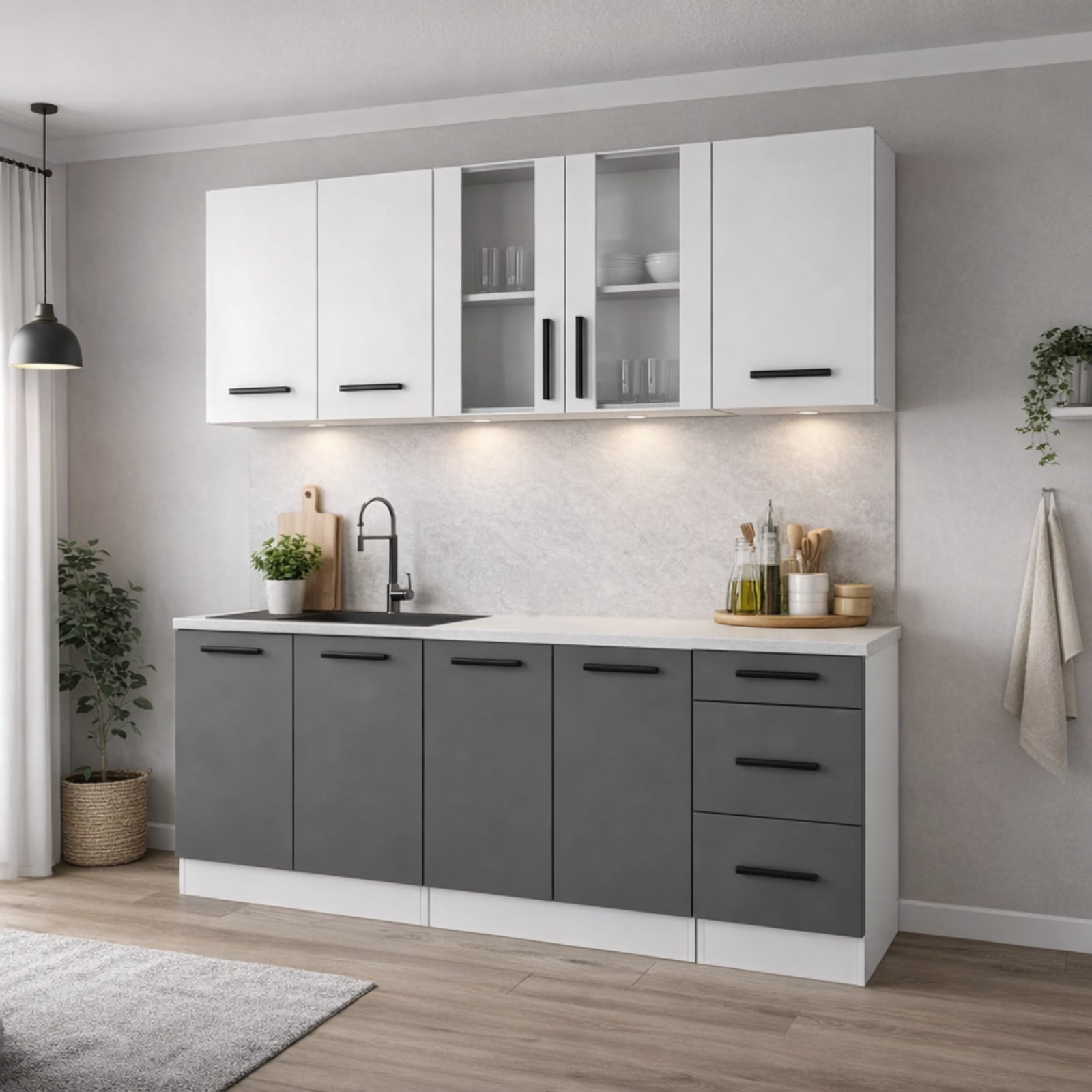 Kuhinja BEST širine 2.00 m donosi savršen spoj modernog dizajna i funkcionalnosti. Kombinacija bijelih i sivih fronti s mat završnom obradom daje prostoru elegantan i savremen izgled. Idealna je za svakodnevnu upotrebu i lako se uklapa u svaki interijer.