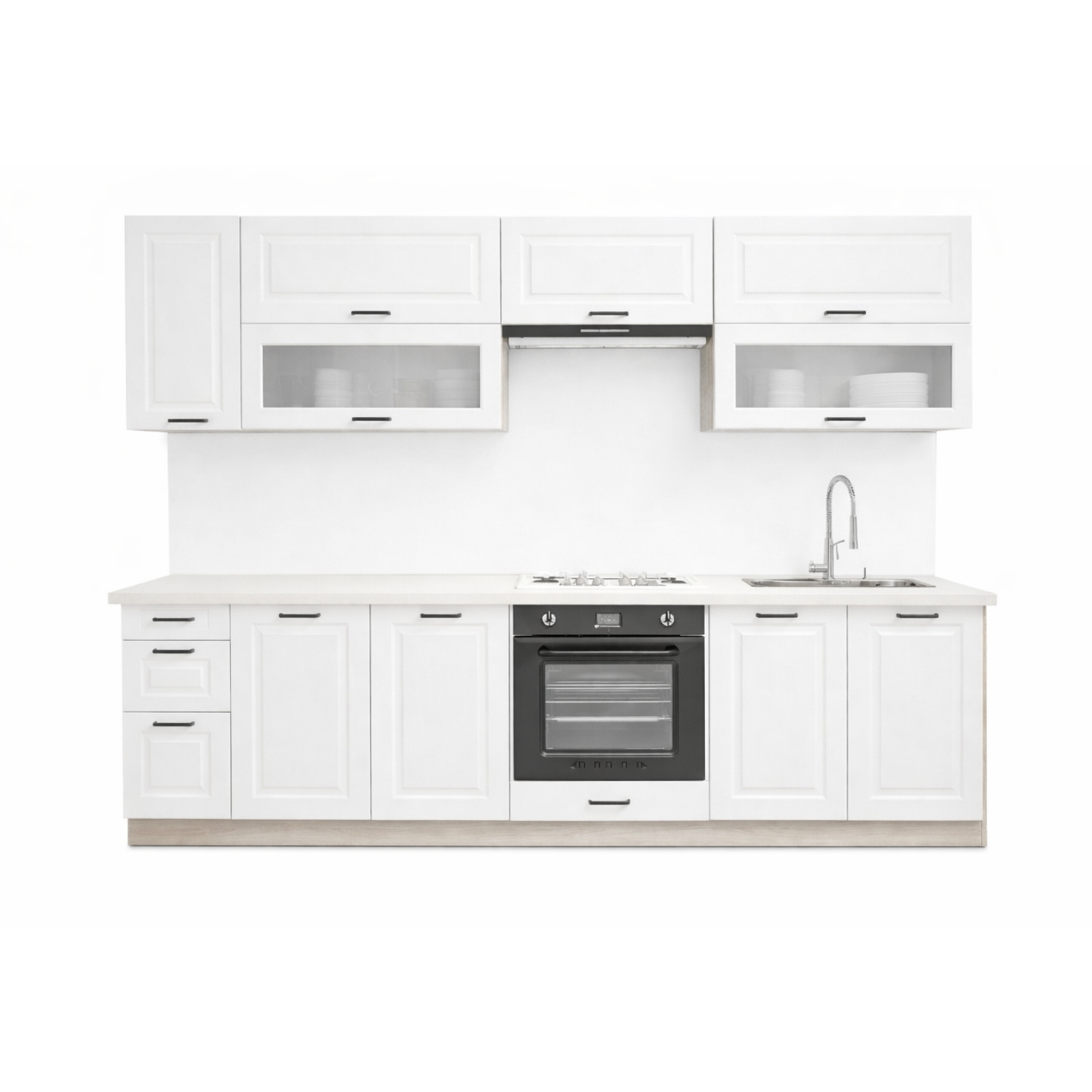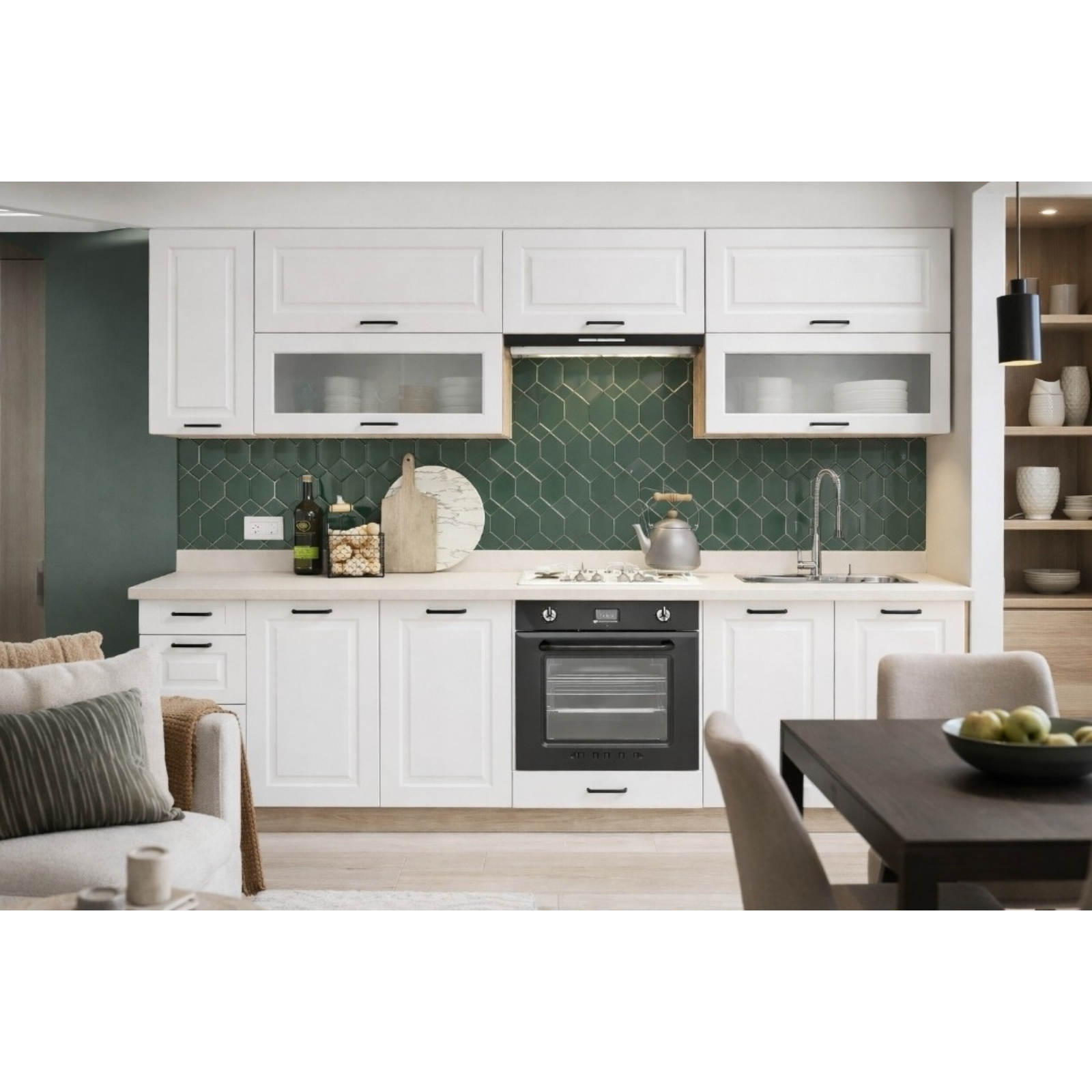 Kuhinjski aparati i dodatna oprema nisu uključeni u cijenupećnica, sudoper i napa prikazani su isključivo u ilustrativne svrhe, što omogućava kupcu slobodan izbor elemenata prema vlastitim potrebama i preferencijama.