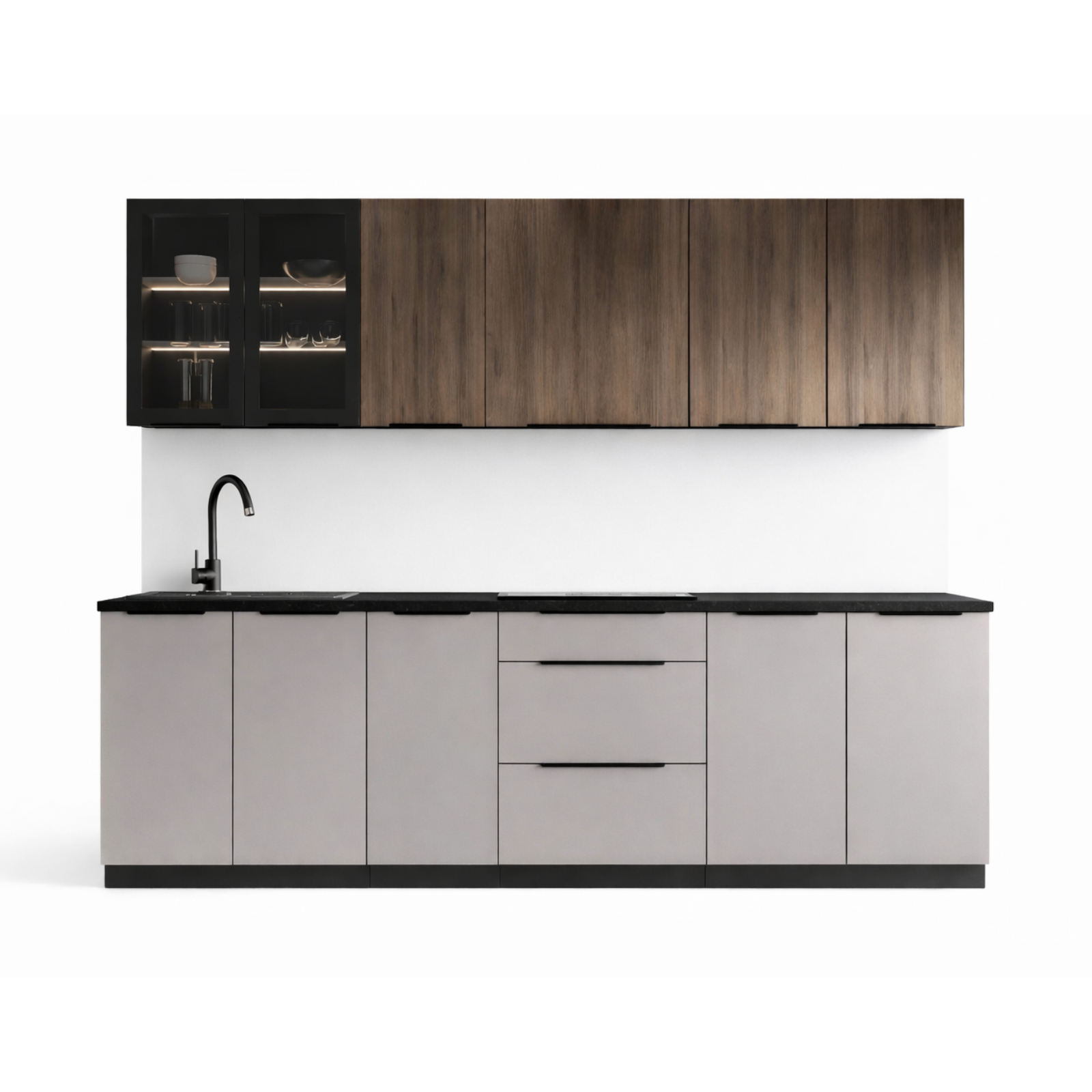 Solea blok kuhinja širine 2,60 m osmišljena je za moderne prostore koji zahtijevaju spoj elegancije, topline i praktičnosti. Donji elementi s kašmirskim frontama donose profinjen i neutralan izgled, dok gornji elementi u dekoru hrasta Okapi unose prirodnu toplinu i vizuelni balans.