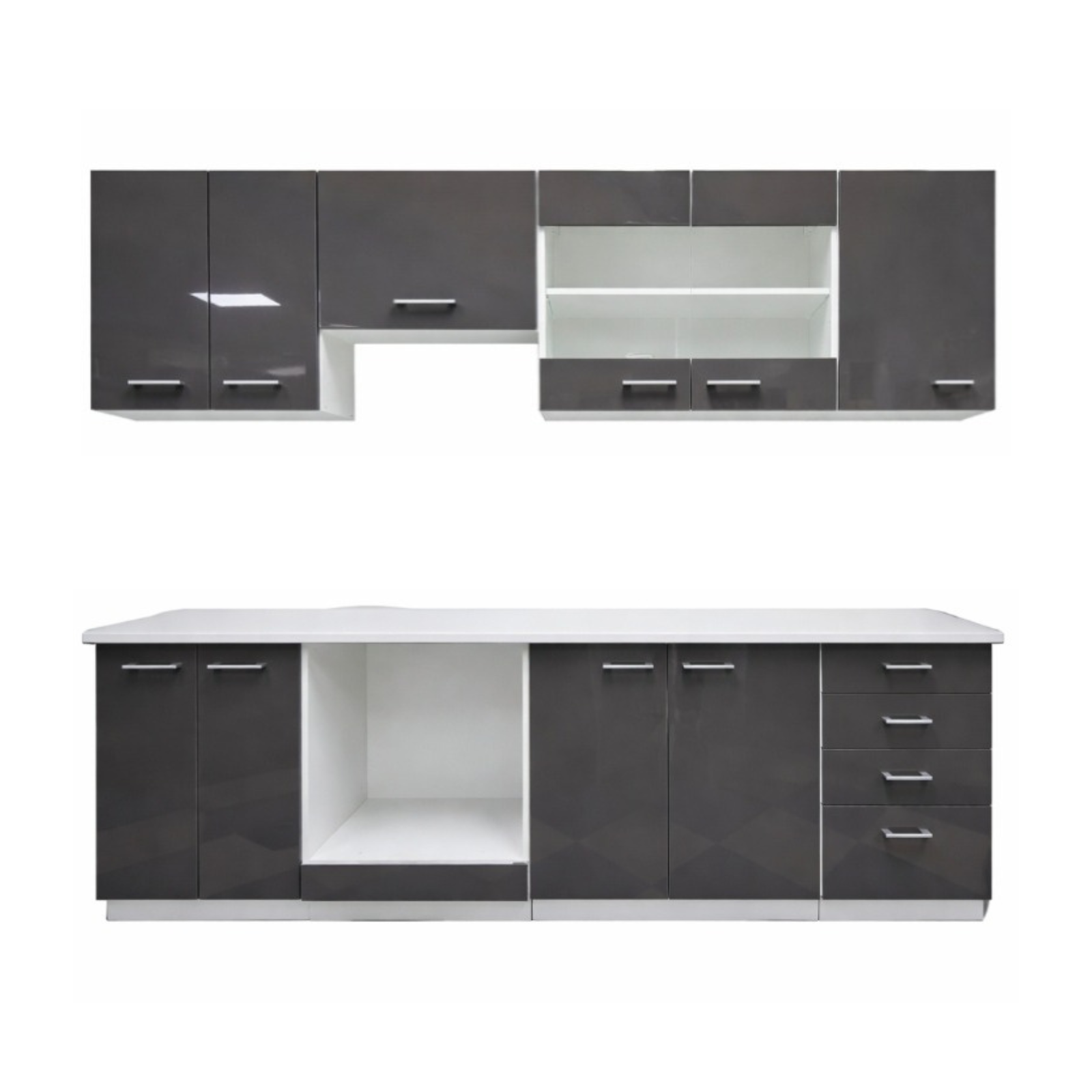 Sonia blok kuhinja širine 2,40 m u tamnosivoj boji visokog sjaja donosi moderan, elegantan i prozračan izgled. Praktičan kuhinjski set s gornjim i donjim elementima, idealan za savremene kuhinjske prostore.