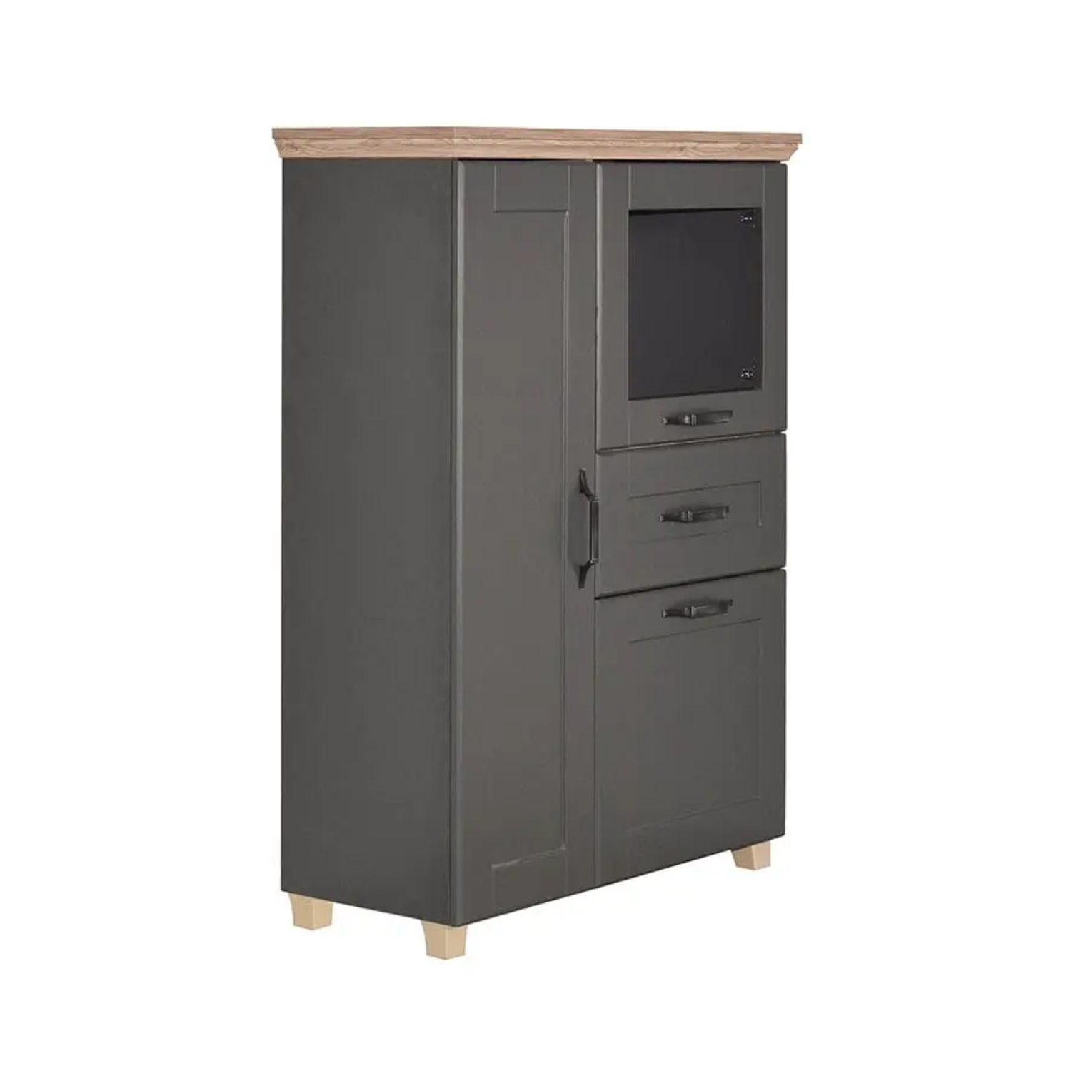 Kombinacija dekora artisan hrasta i sivih fronti savršeno se uklapa u moderne enterijere. Zahvaljujući staklenim frontama i prostranim unutrašnjim policama, vitrina omogućava elegantan prikaz dekorativnih predmeta, knjiga ili staklenog posuđa. Metalne ručice naglašavaju moderan izgled, a kvalitetna izrada garantuje dug vijek trajanja.