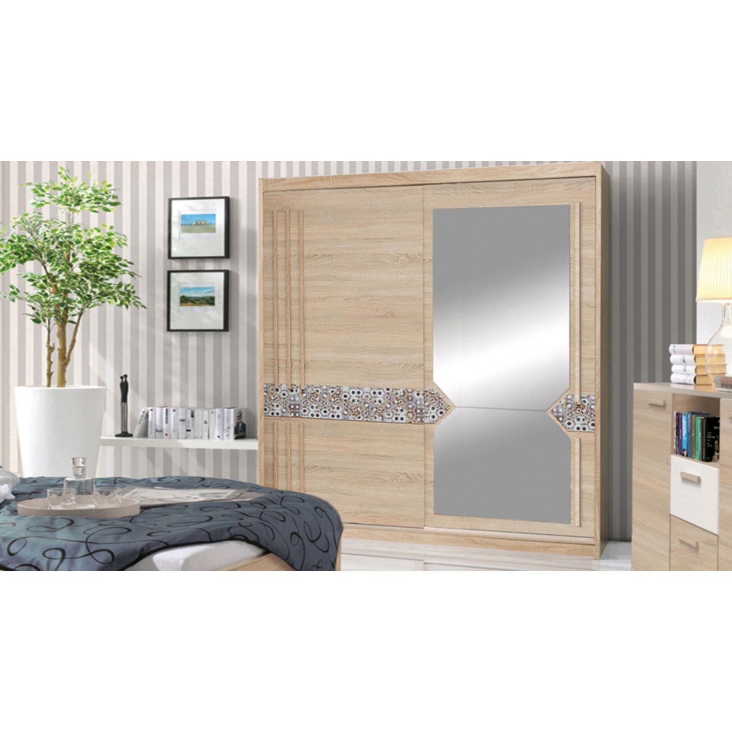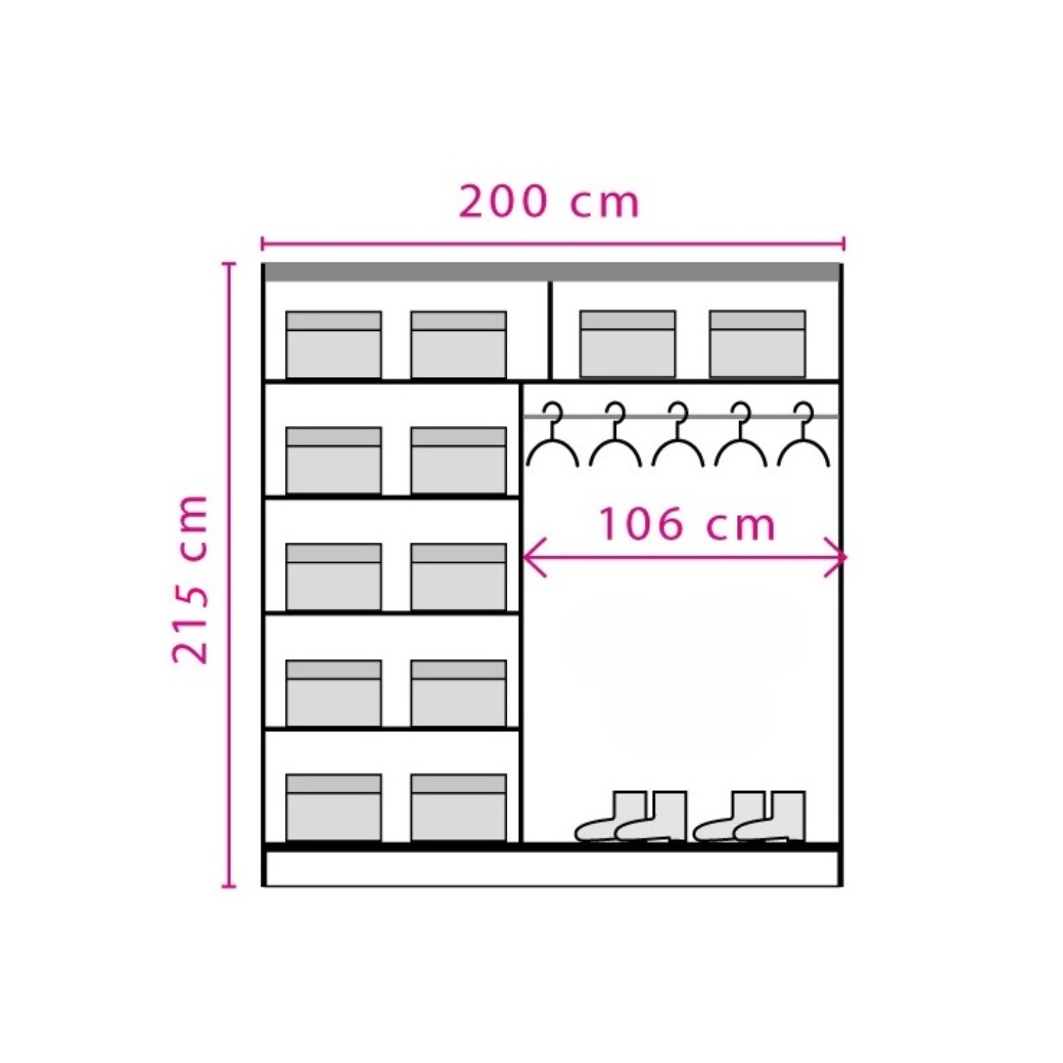 Ormar je opremljen kliznim vratima koja omogućavaju maksimalnu iskorištenost prostora, pa je savršen i za manje spavaće sobe ili garderobere. Unutrašnjost je funkcionalno organizirana, nudeći dovoljno prostora za odlaganje odjeće, obuće i dodataka, te omogućava lako održavanje reda i preglednosti.