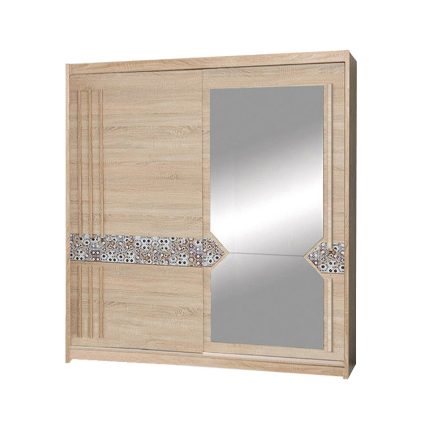 Atena AT2-200 je idealan izbor za sve koji žele prostran, praktičan i elegantan klizni ormar. Izrađen je od kvalitetne laminirane iverice debljine 16 mm, sa ABS rubovima koji osiguravaju otpornost na habanje i dugotrajnu čvrstoću. Njegov moderni dizajn ističe se sonoma hrast dekorom i ukrasnim umecima na frontama, dok veliko ogledalo na desnoj strani dodatno doprinosi estetici i vizualno povećava prostor.