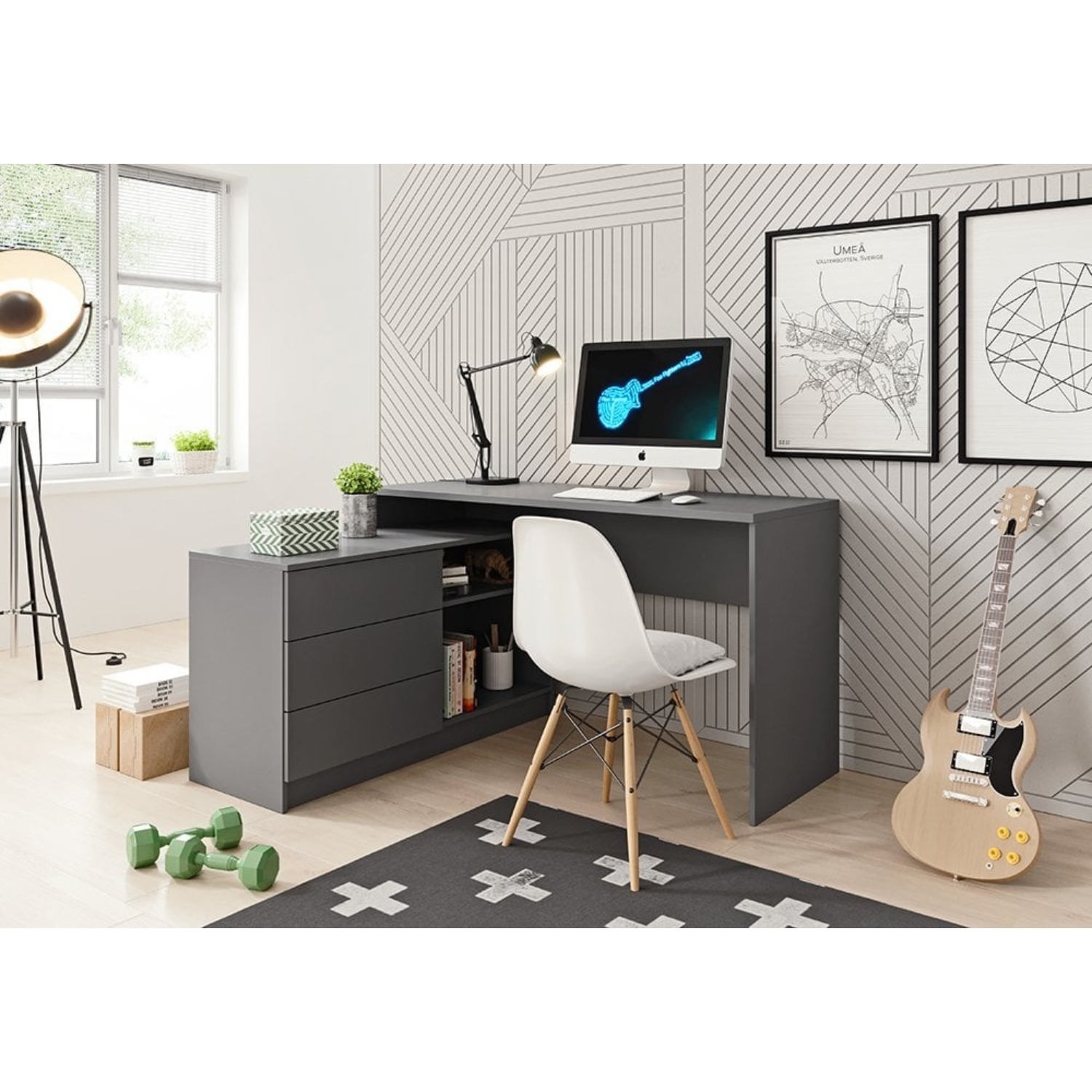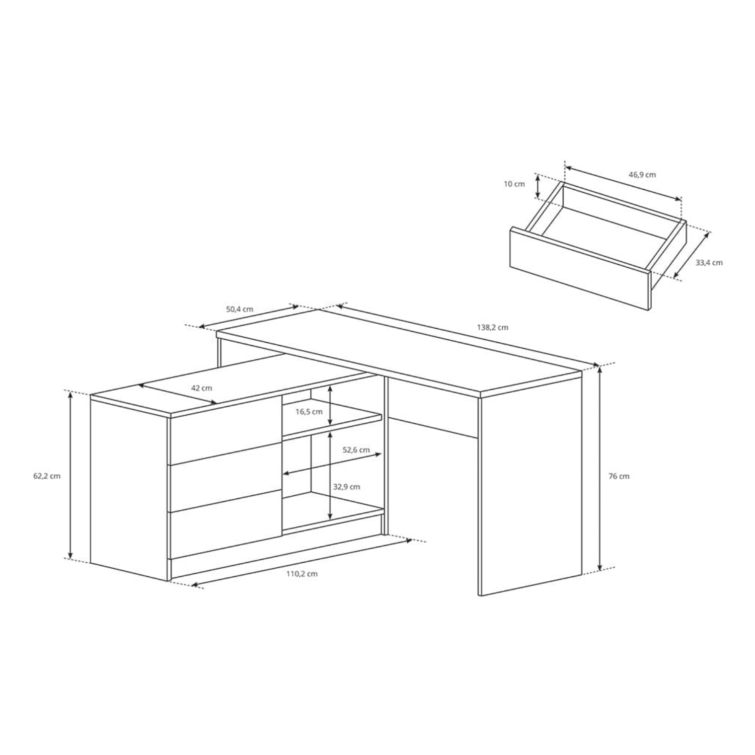 Zahvaljujući svom kutnom dizajnu, stol pruža prostranu radnu površinu i savršeno iskorištava prostor. Opremljen je s tri prostrane ladice koje omogućuju sigurno odlaganje dokumenata, uredskog pribora i drugih potrepština, dok otvorena polica dodatno olakšava organizaciju stvari koje želite imati pri ruci.