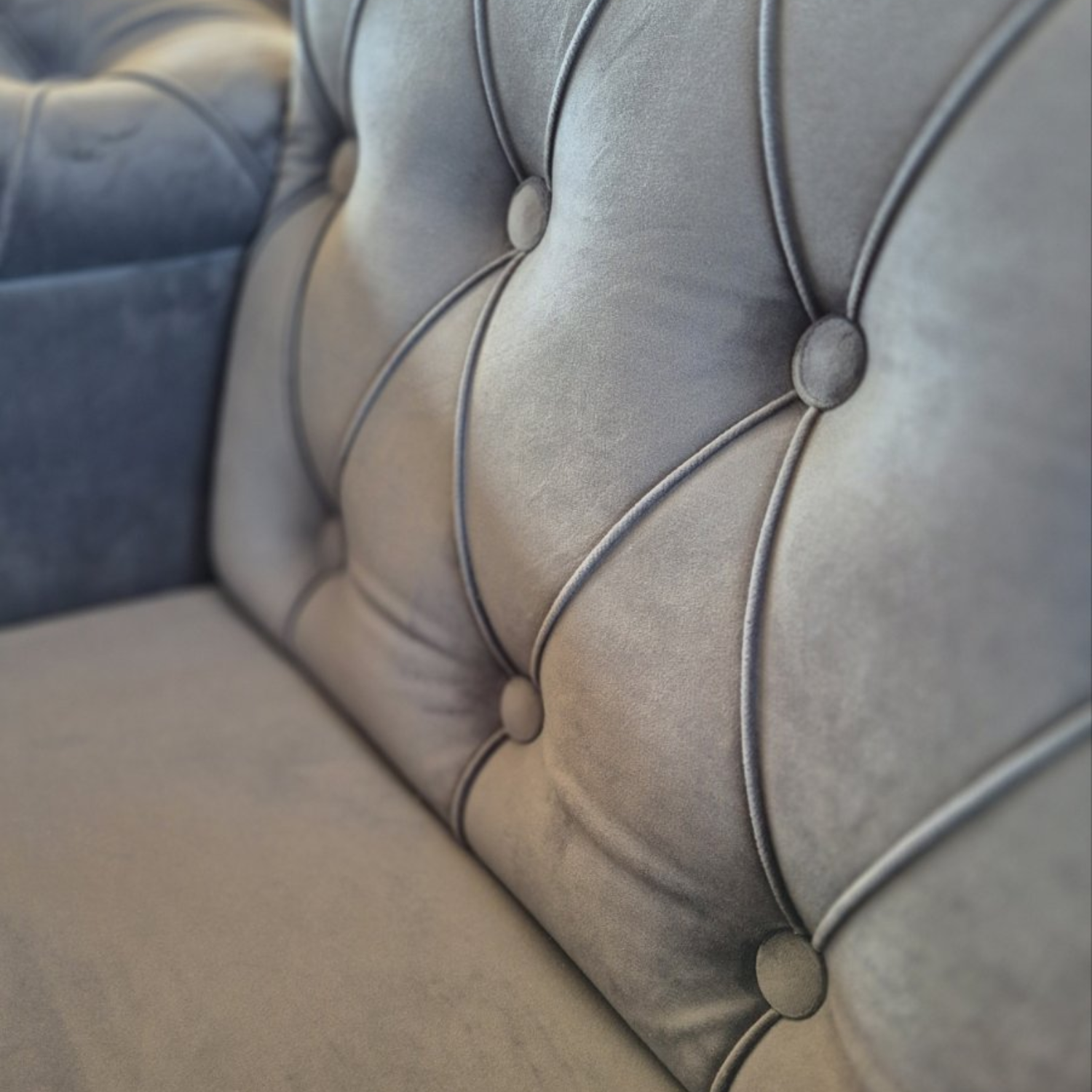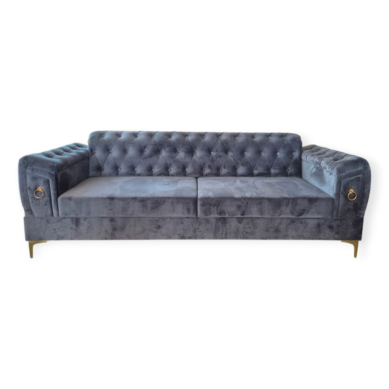 Trosjed Nesy – Sivi odiše sofisticiranošću i komforom, idealan za sve koji žele spoj luksuza i praktičnosti u svom domu. Njegov dizajn sa prepoznatljivim prošivima i ukrasnim detaljima, poput zlatnih prstenova na bočnim stranama, daje prostoru poseban šarm i eleganciju.