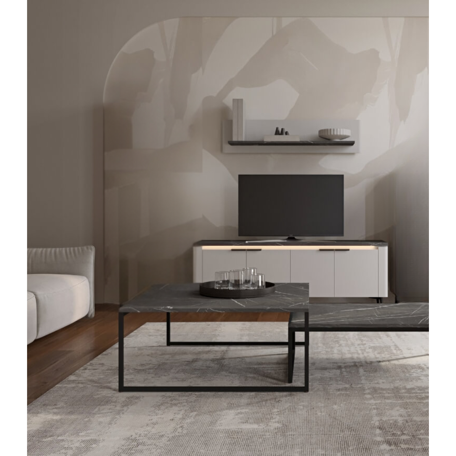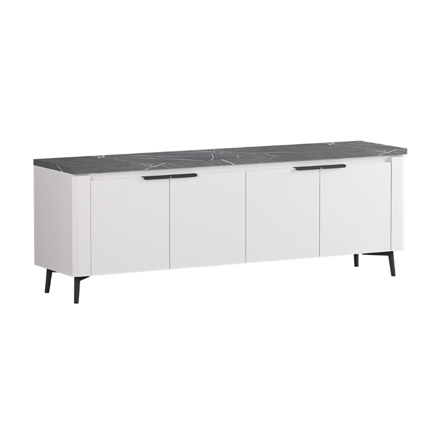TV komoda Astana 165 savršeno spaja kvalitetne materijale i atraktivan dizajn, čineći je idealnim izborom za moderne enterijere. Sa dimenzijama 165,2 × 40 × 60 cm, nudi obilje prostora za televizor i dodatnu opremu, dok elegantna kombinacija bijelog sjaja i crnog mermera daje prostoru luksuzan izgled.