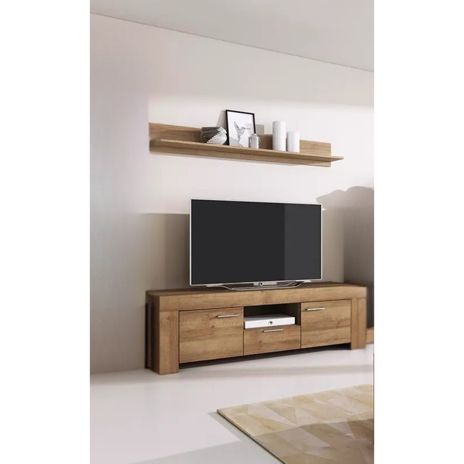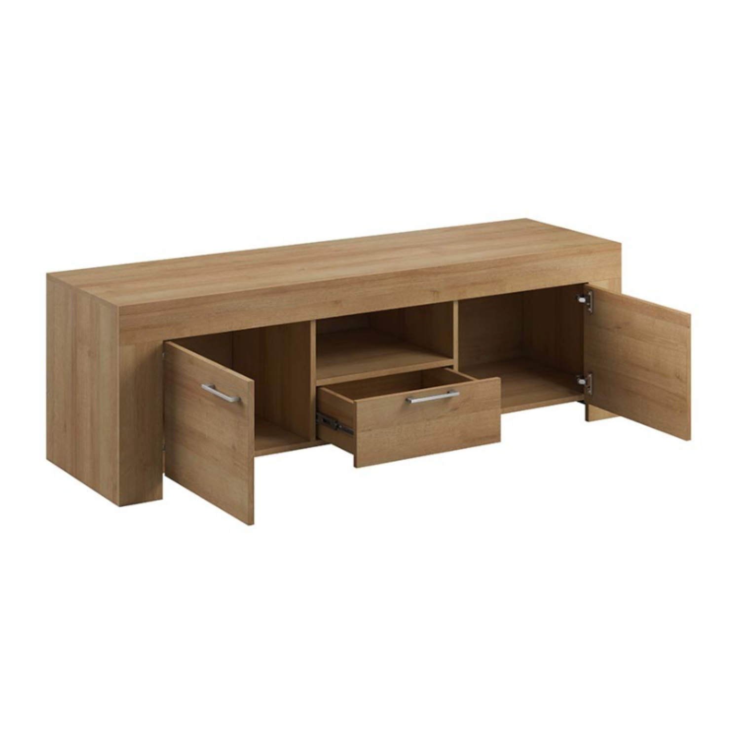 TV komoda Sky SRTV155 + zidna polica Sky P155 predstavljaju idealno rješenje za moderan dnevni boravak. TV element dimenzija 155 × 50 × 47 cm pruža dovoljno prostora za televizor i dodatnu opremu, dok zidna polica dimenzija 155 × 20 × 22 cm omogućava postavljanje knjiga, dekoracija ili fotografija.