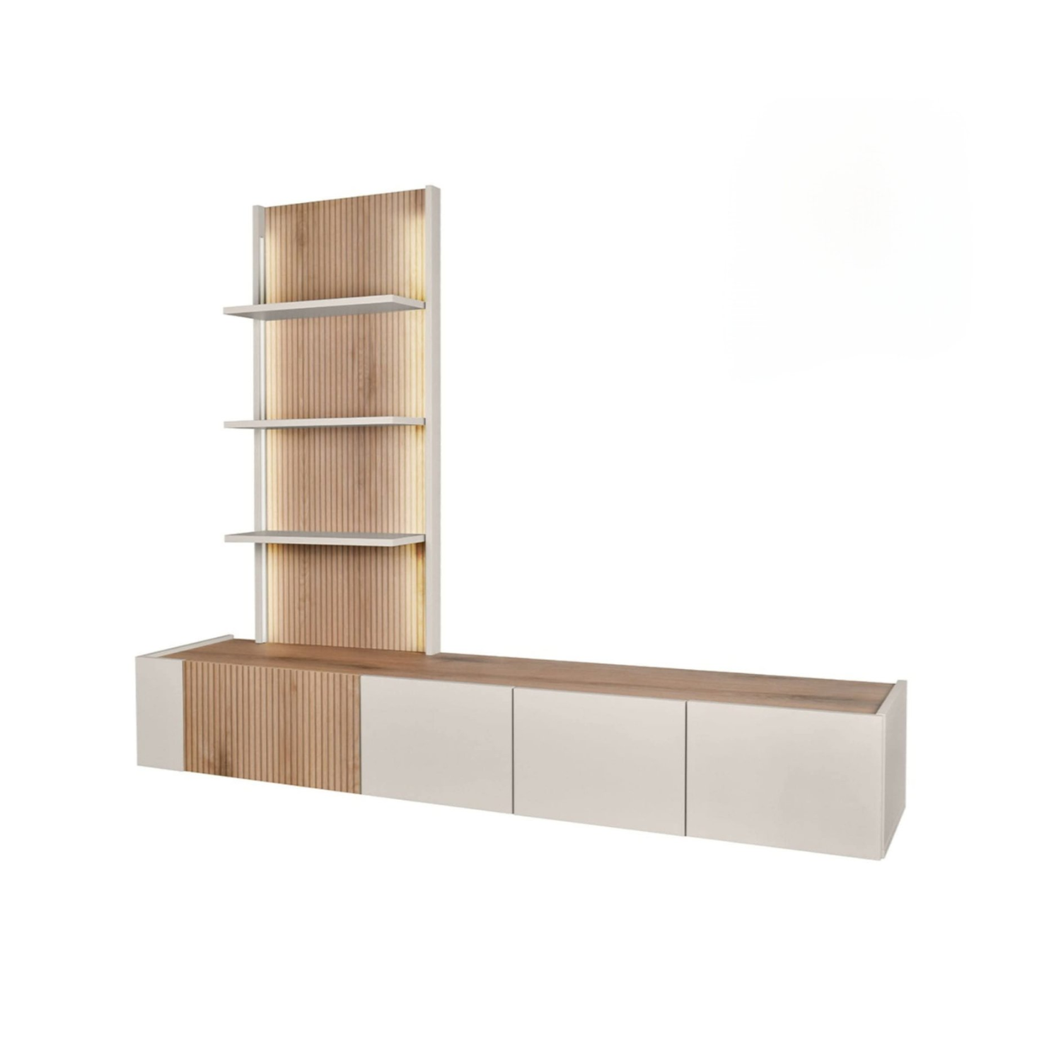Smart TV komoda izrađena je od kvalitetnog univera debljine 16 mm, što osigurava stabilnost i dugotrajnost. Dekor Kanela – Kašmir donosi toplinu i moderan izgled prostoru, dok prostrani odjeljci omogućavaju uredno odlaganje multimedijalnih uređaja, kablova i dodatne opreme.