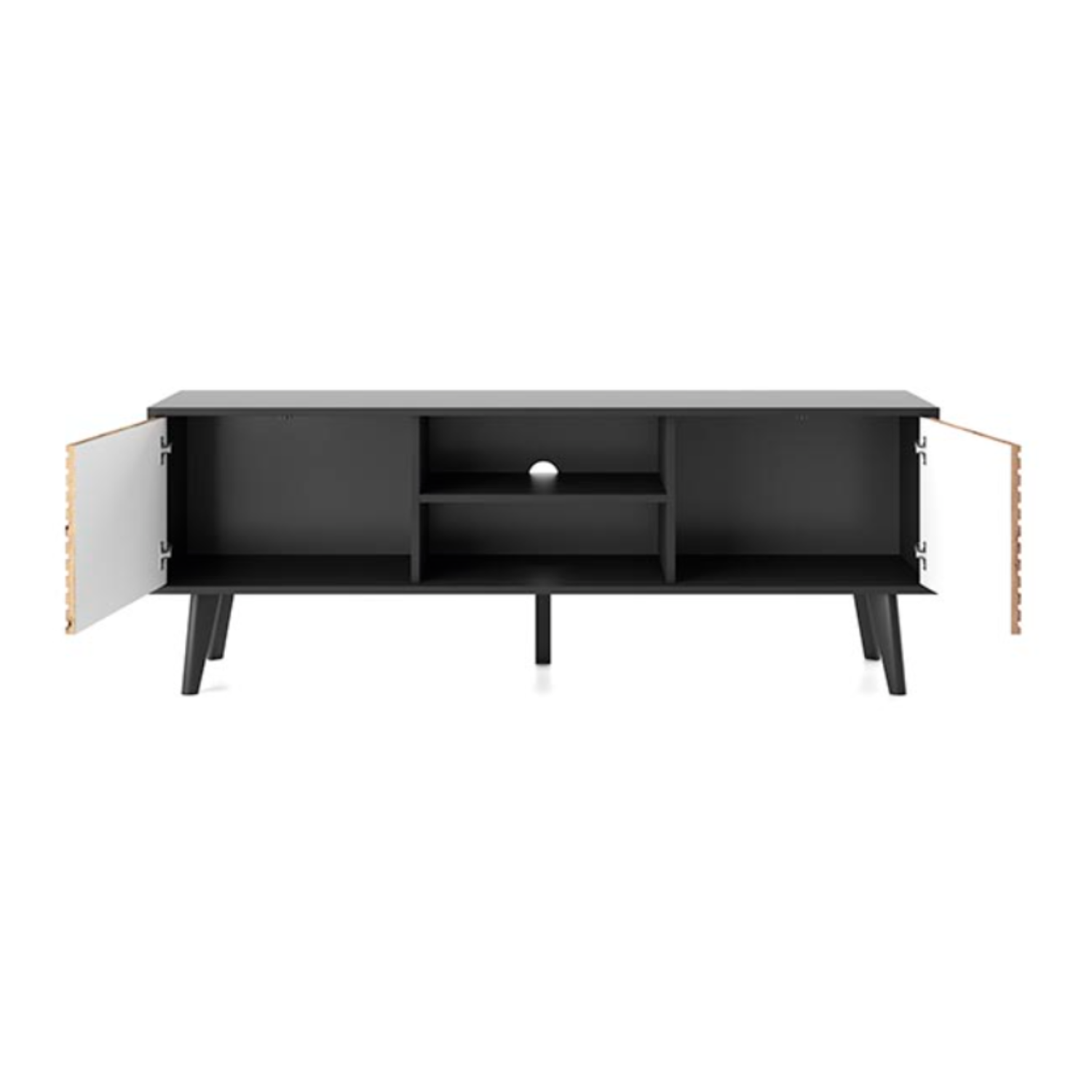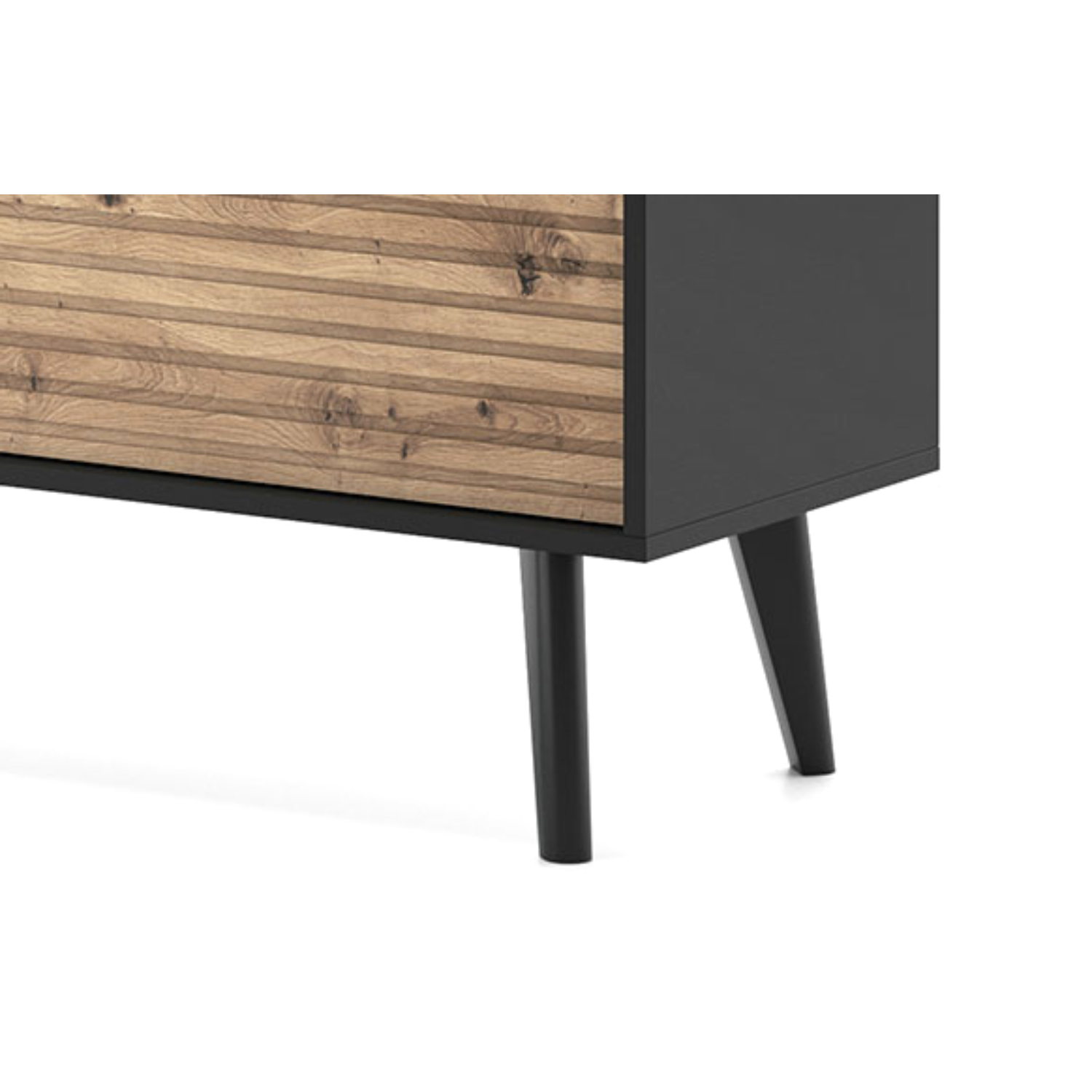 Moderan dizajn sa vodoravnim linijama na frontama i minimalističkim otvaranjem bez ručki daje komodi sofisticiran izgled. Prostrani odjeljci omogućavaju uredno odlaganje multimedijalnih uređaja, kablova i dodatne opreme.