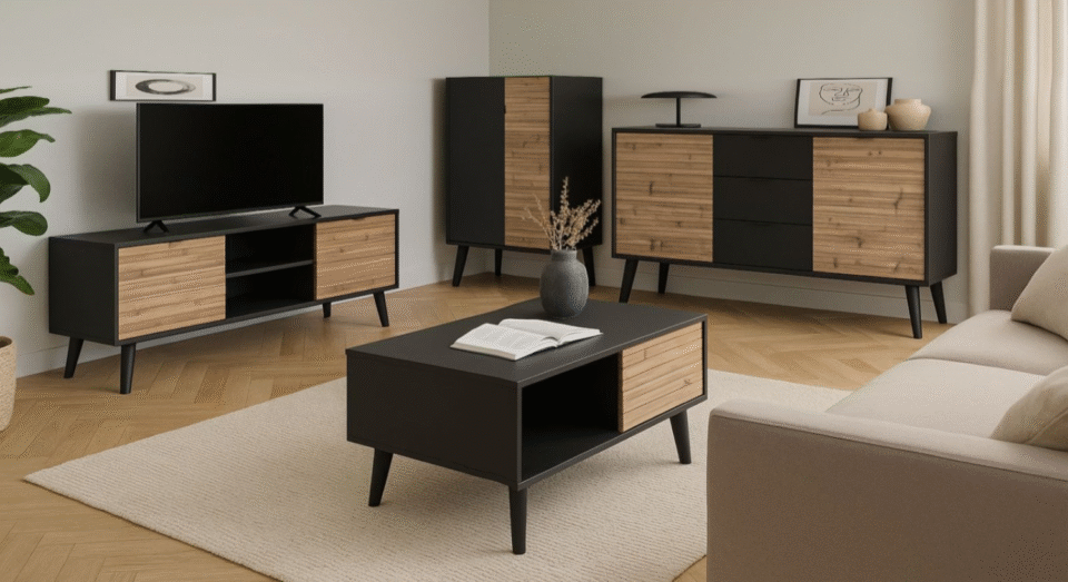 Willow TV komoda izrađena je od visokokvalitetne laminirane ploče debljine 16 mm i MDF fronti, što osigurava trajnost, stabilnost i luksuzan izgled. ABS rubovi štite površine od oštećenja, dok visoke crne drvene nogice omogućavaju prozračnost i lakše čišćenje ispod elementa.