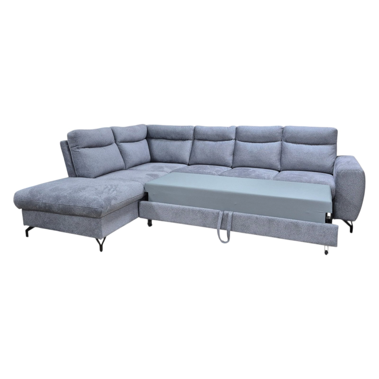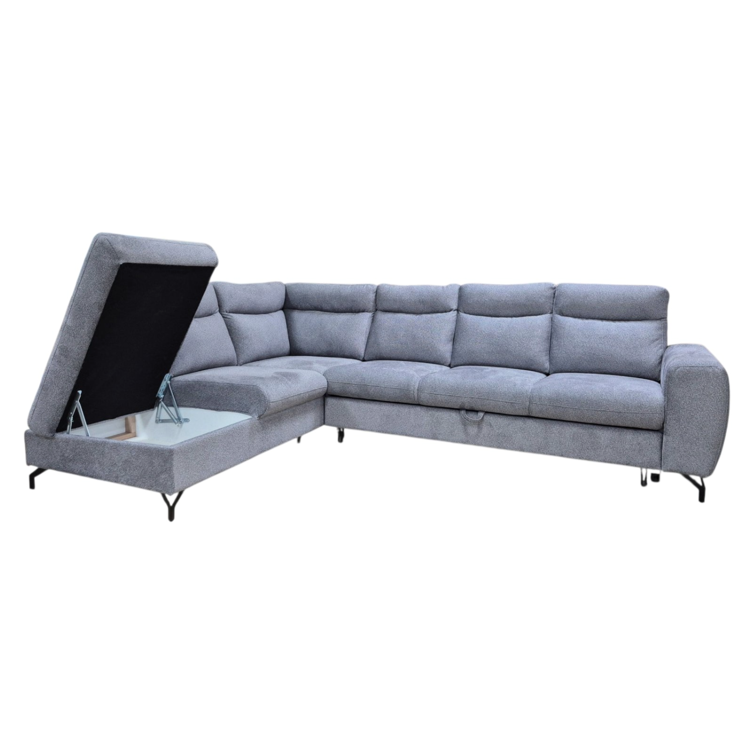 Ova garnitura se savršeno uklapa u savremene interijere, sa sofisticiranim metalnim nogama koje dodatno naglašavaju njen stil.