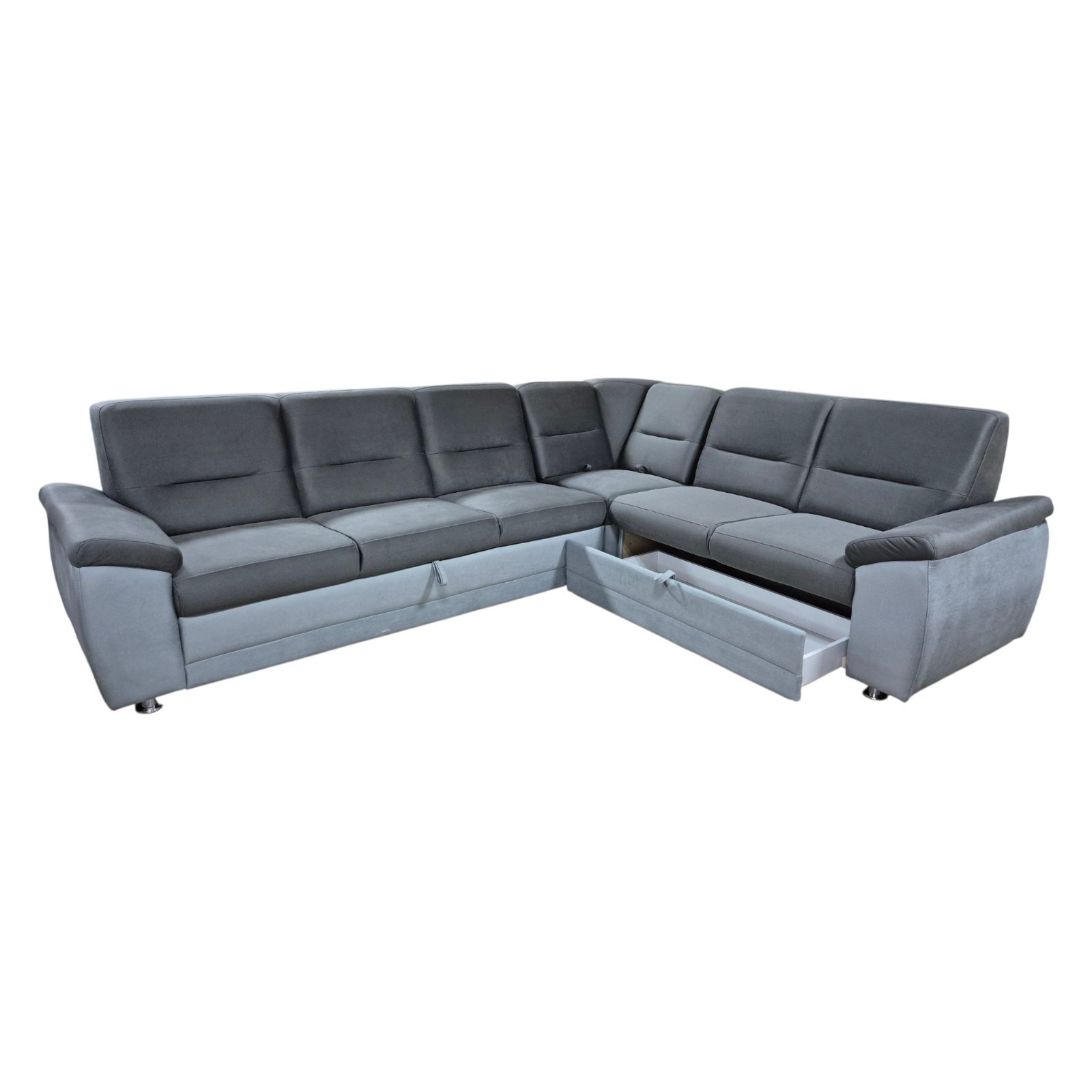 Trosjed se lako razvlači i pretvara u pomoćni ležaj, dok dvosjed sadrži praktičnu ladicu za posteljinu i druge stvari. Dodatni plus je pomični naslon u uglu, koji se izvlači prema naprijed i omogućava udobnije sjedenje ili ležanje.