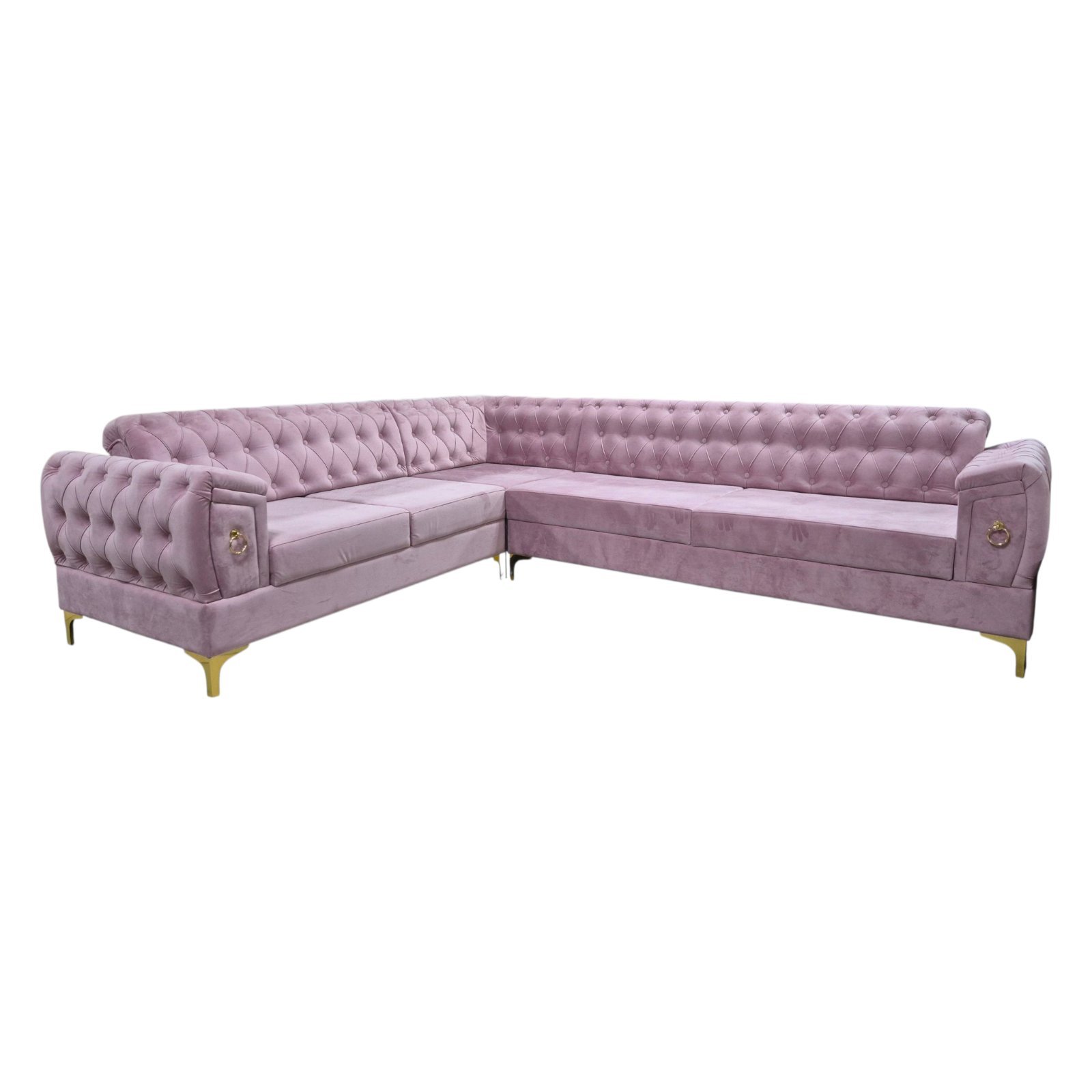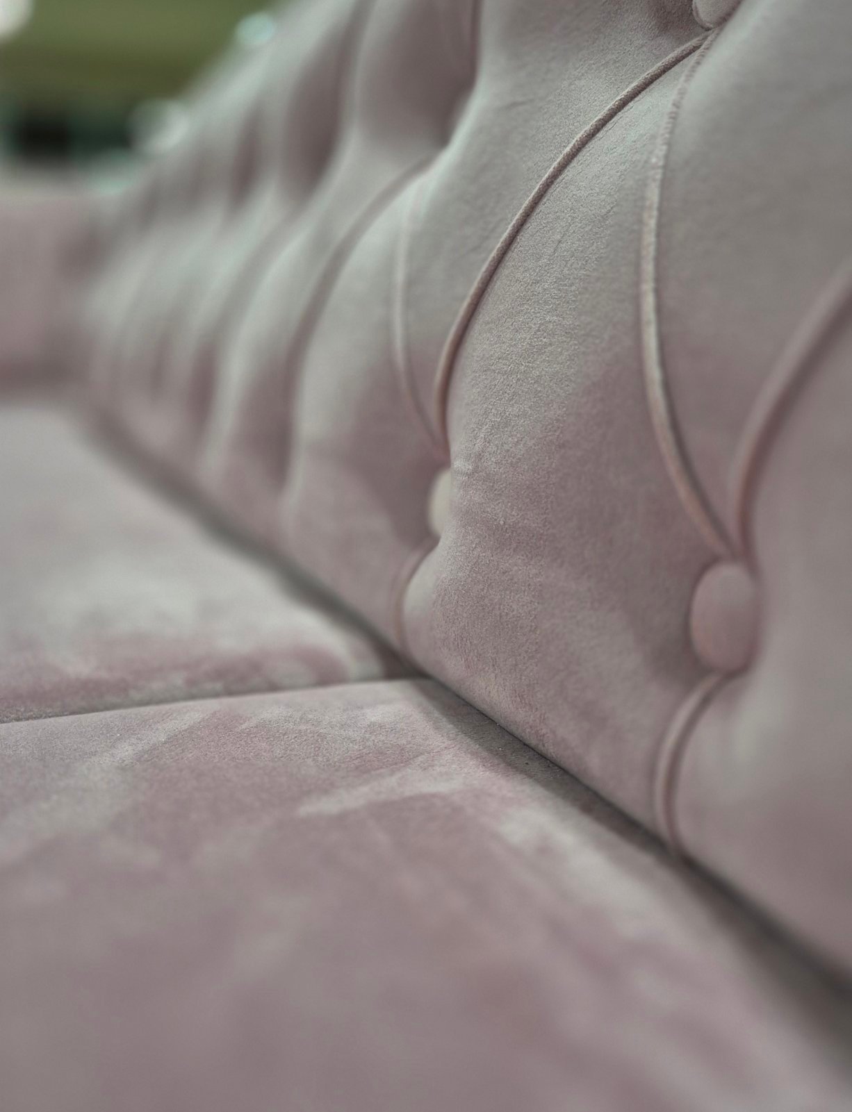Zlatne nogice dodatno doprinose ekskluzivnom izgledu i olakšavaju održavanje, dok bočni nasloni ukrašeni dekorativnim metalnim prstenovima upotpunjuju sofisticirani dojam. Presvlaka je u svijetlom roze tonu koji dominira u svakom dnevnom boravku.