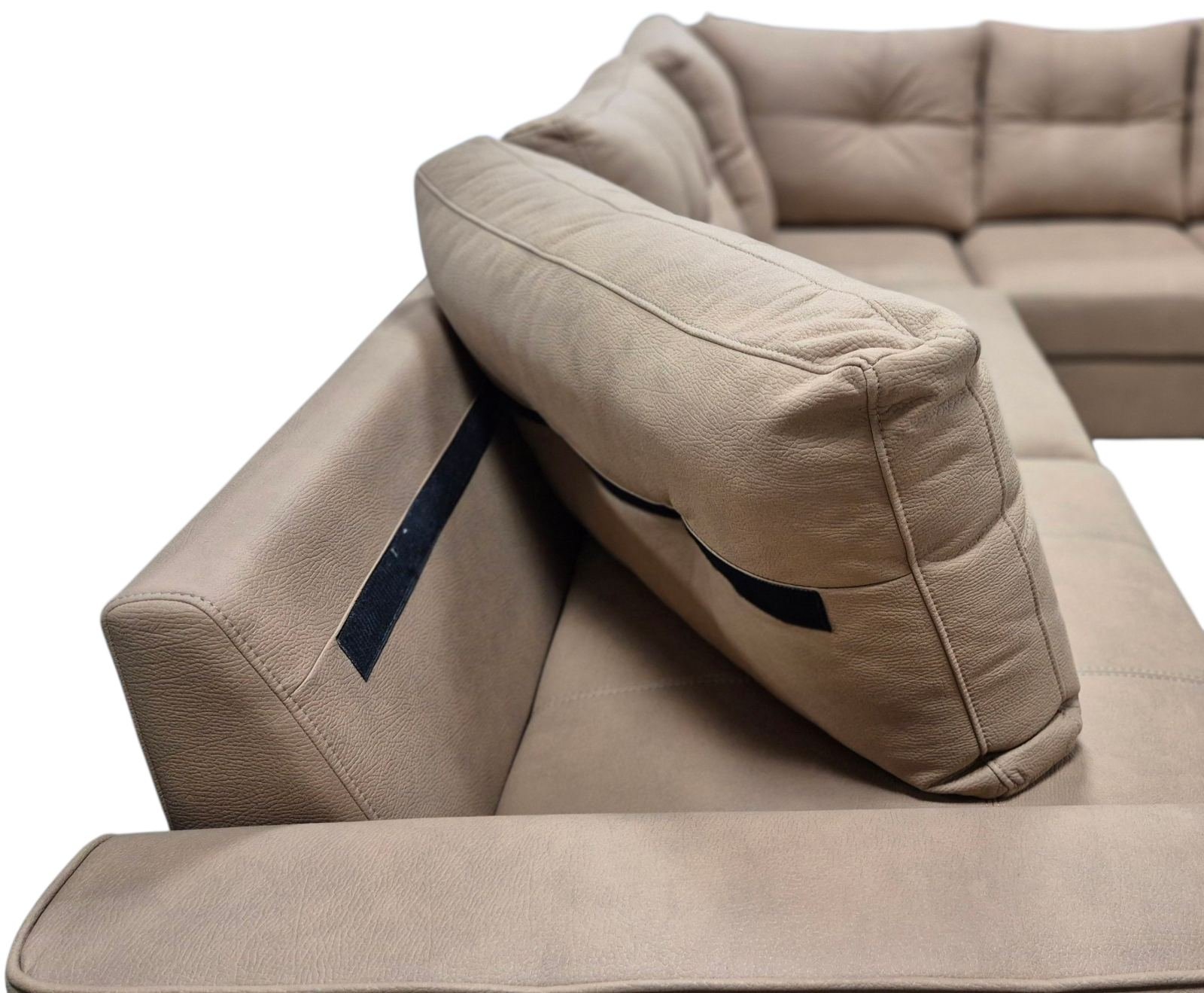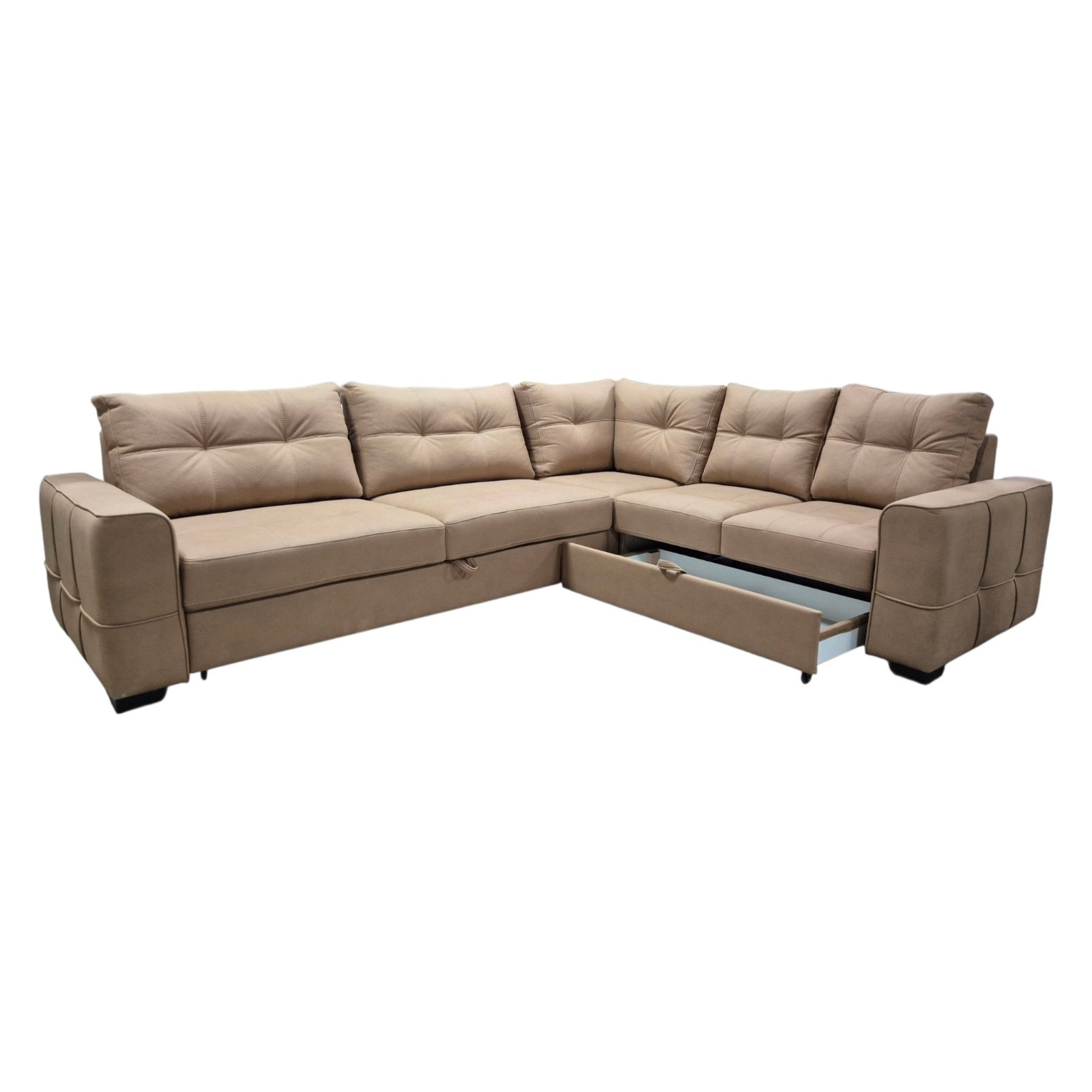 Presvlaka u toploj nijansi pruža luksuzan izgled, a štepani detalji na bočnim stranama i jastucima naglašavaju dizajnerski pristup. Niski crni nogari zaokružuju cjelokupan izgled.