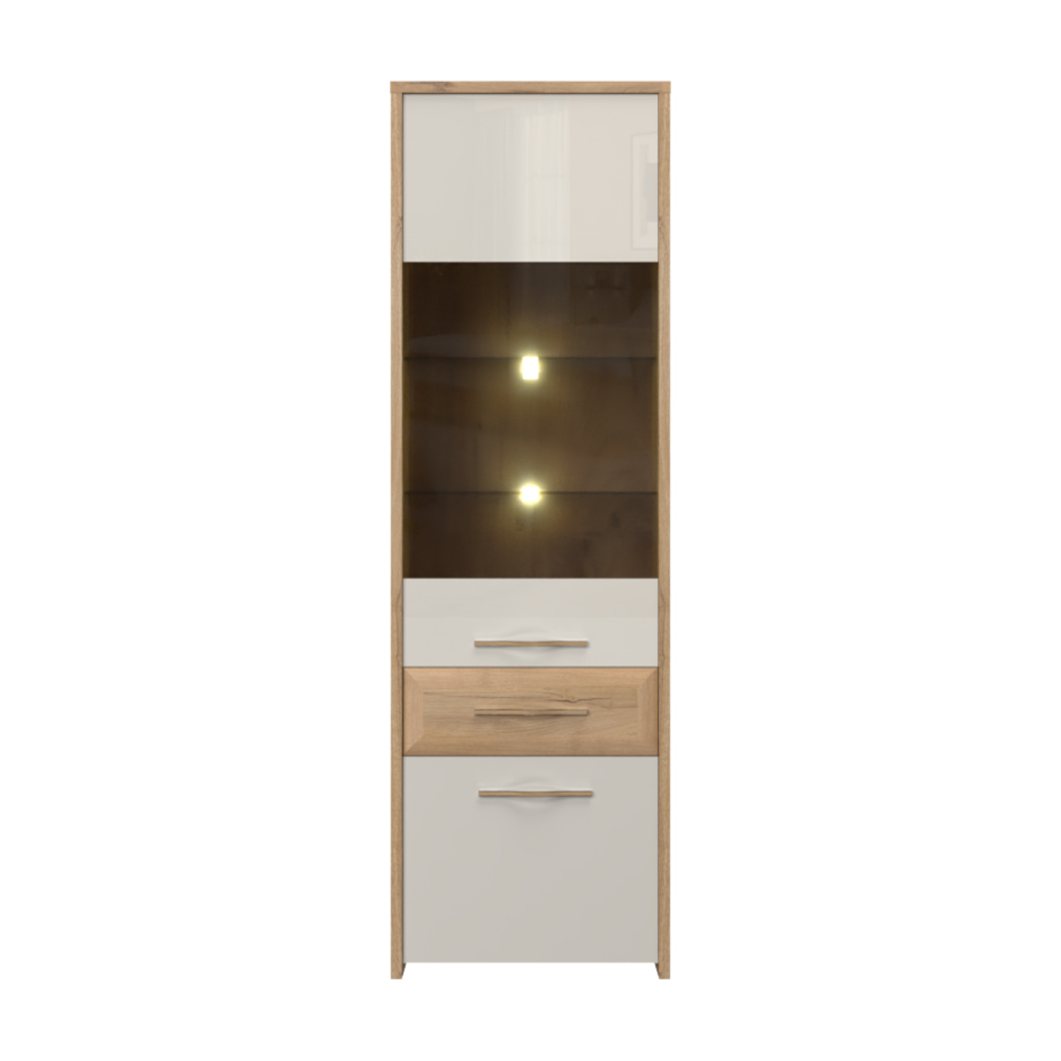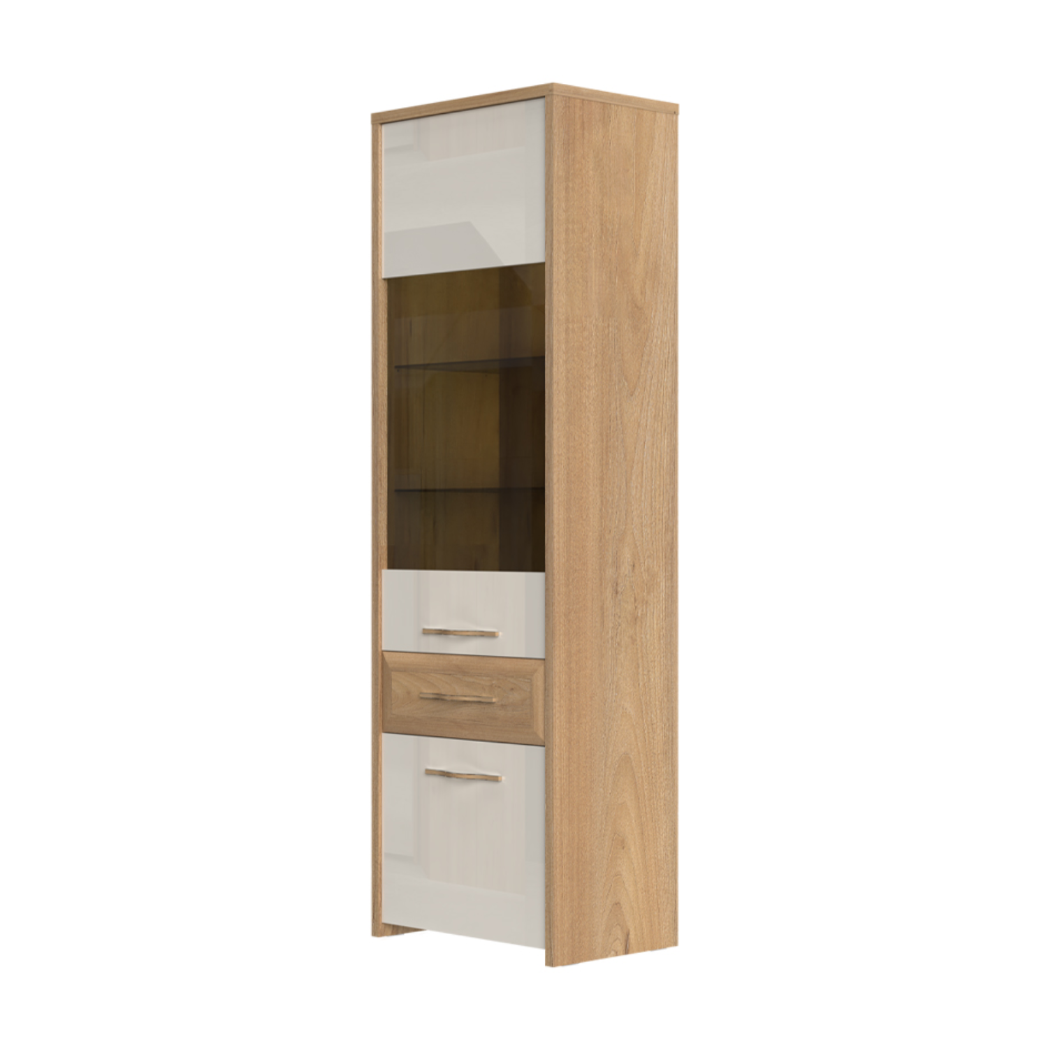 Visoka vitrina Gala V61-2KS1F/GL iz kolekcije Gala nudi spoj modernog dizajna, funkcionalnosti i vrhunskog kvaliteta izrade. Opremljena je jednim punim i jednim staklenim krilom te fiokom, omogućavajući savršenu organizaciju i izlaganje dekorativnih predmeta.