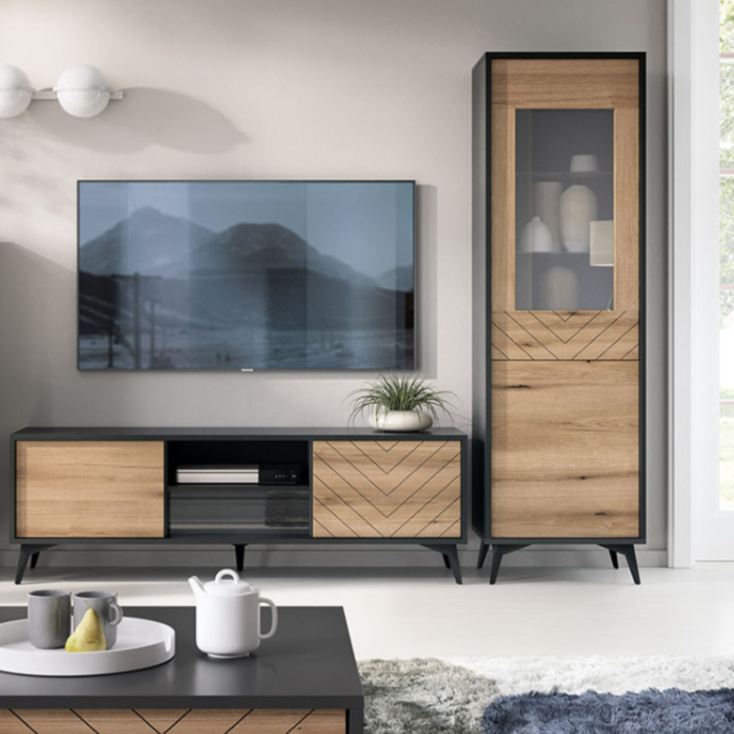 Diamond W54 vitrina je idealan izbor za moderne dnevne boravke i minimalističke interijere. Sa svojom kombinacijom laminiranih ploča debljine 16 mm i push-to-open sistema otvaranja, donosi čistu estetiku bez vidljivih ručki. Fronte u dekoru hrasta evoka doprinose toplini prostora, dok korpus u crnoj strukturi daje kontrast i luksuzan izgled.