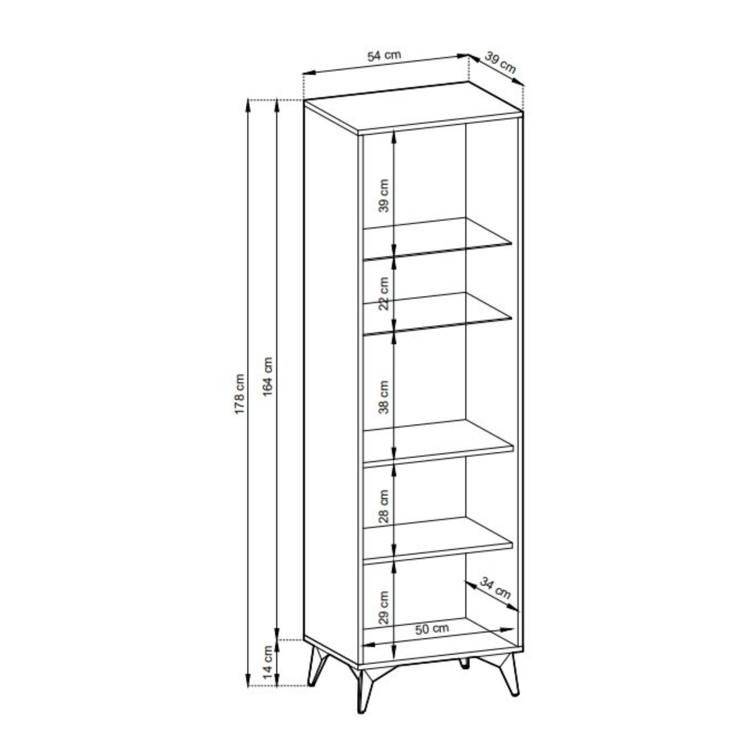 Unutrašnjost vitrine je praktično raspoređena, savršena za organizaciju dekorativnih predmeta, knjiga i sitnica, dok elegantne crne metalne nogice visine 14 cm unose dodatnu prozračnost i lakoću u dizajn.